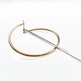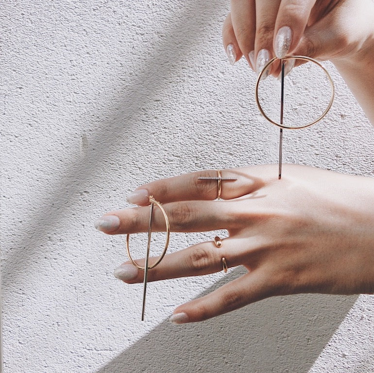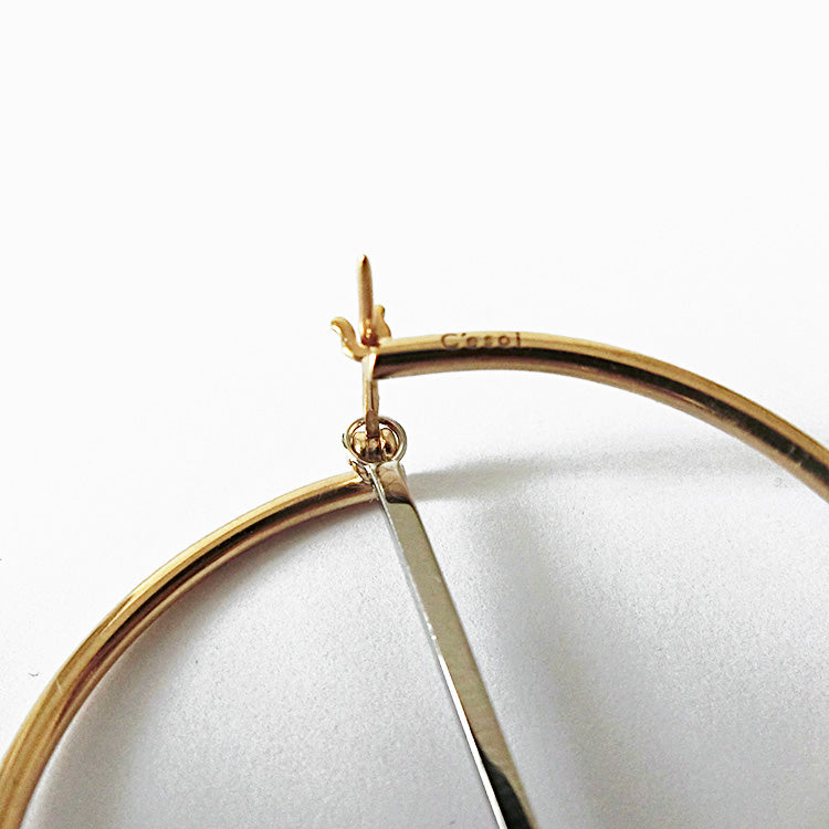 These earrings have a striking yet delicate look, with a dangling bar in the center of the hoop.