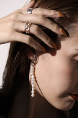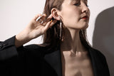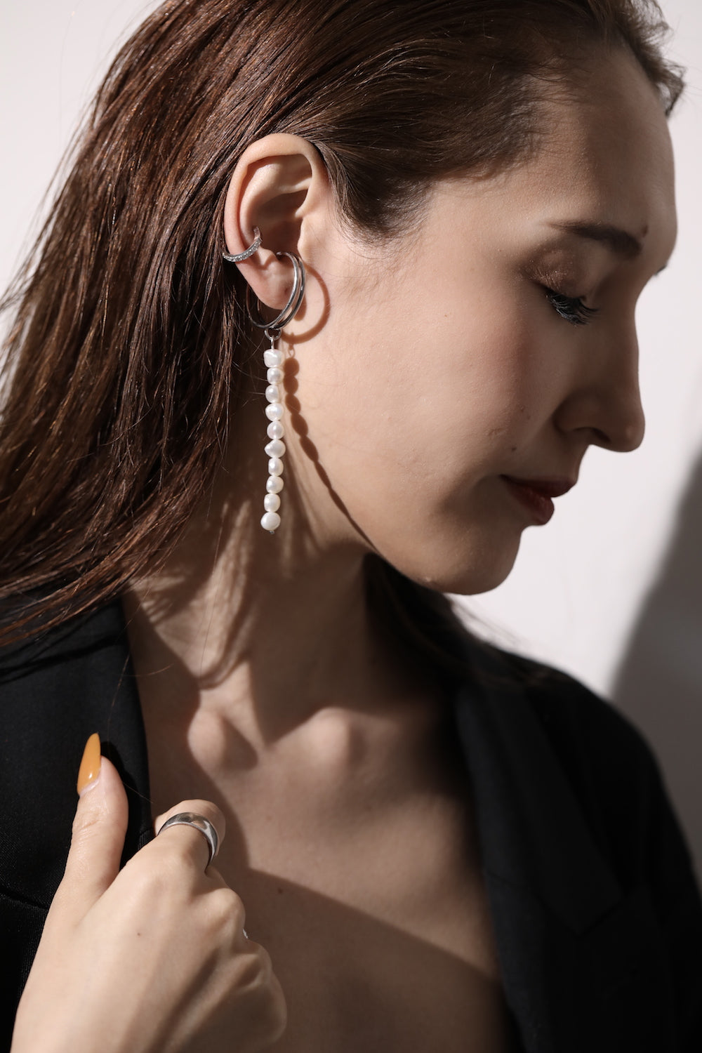 This earring features a delicate chain and a string of freshwater pearls, adding a touch of color to your ears. It can be worn as an accent for casual outfits or for parties.