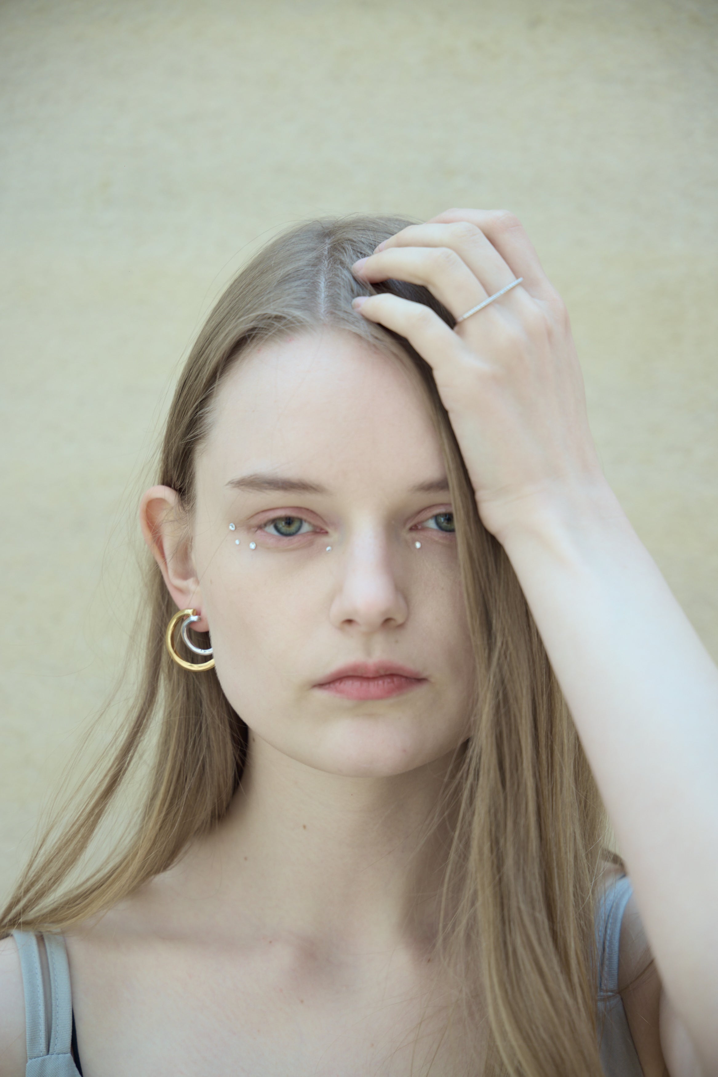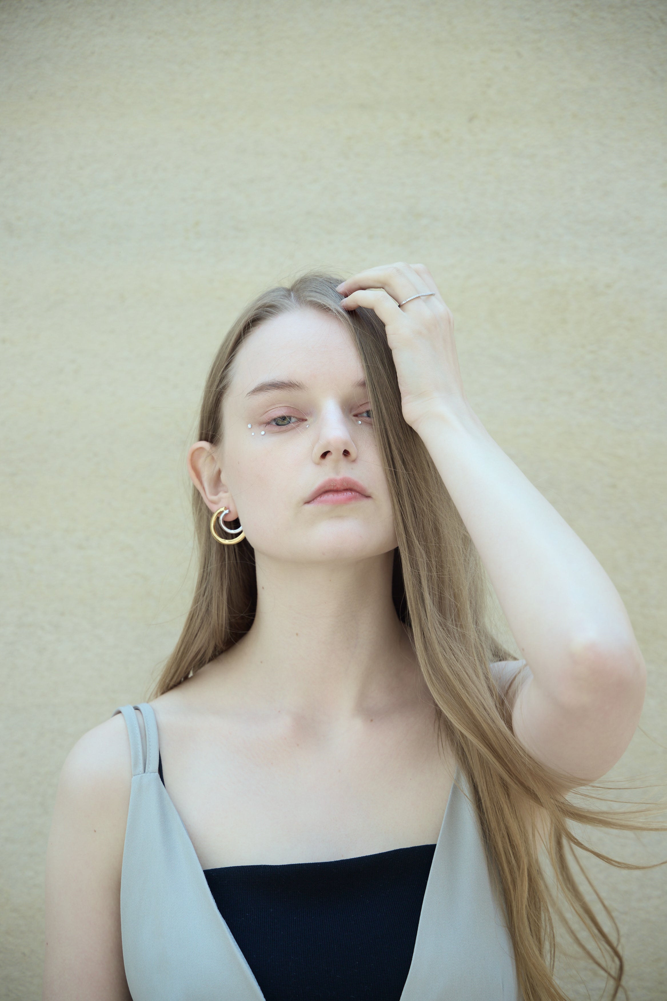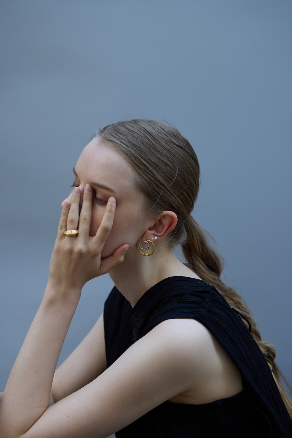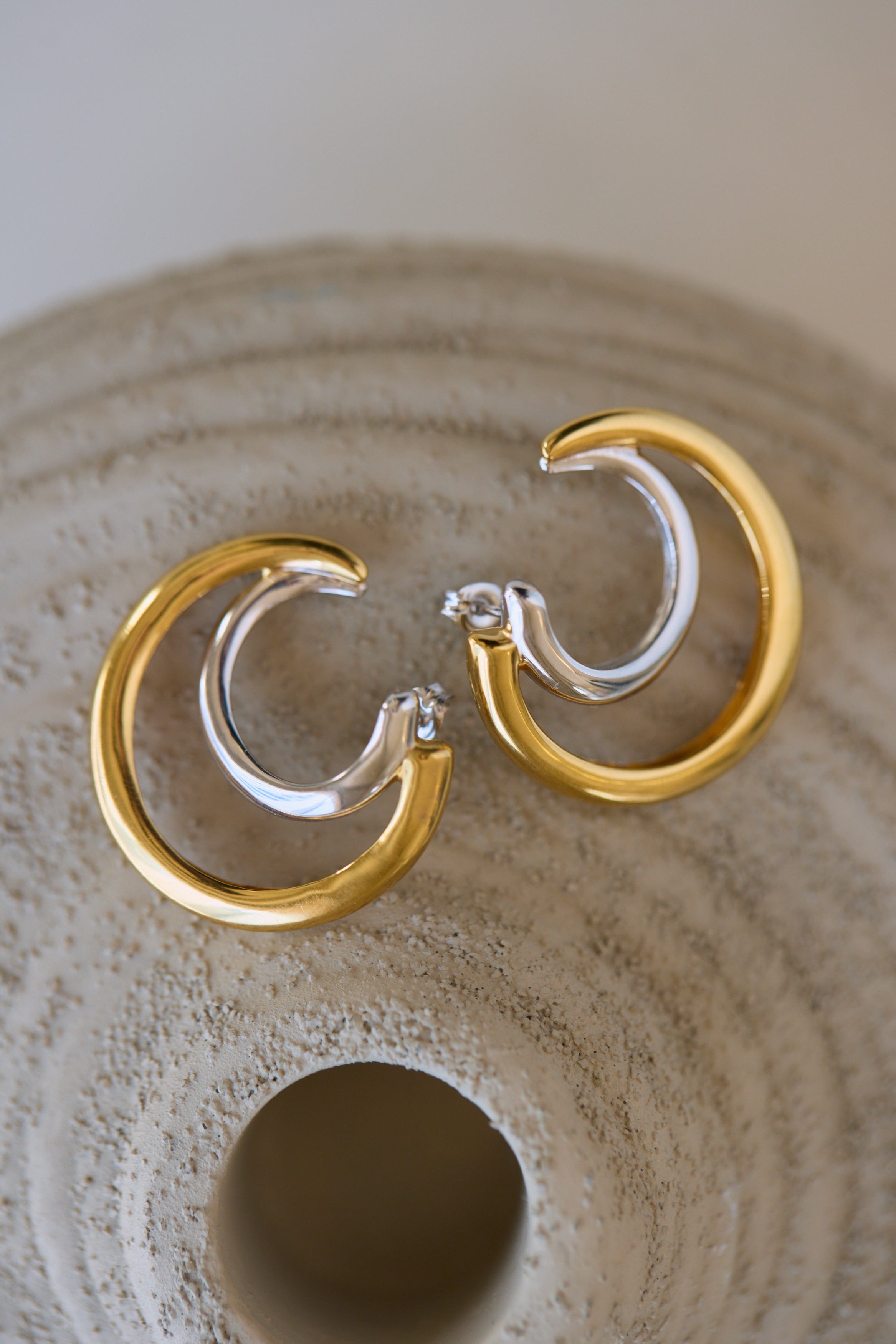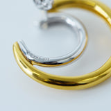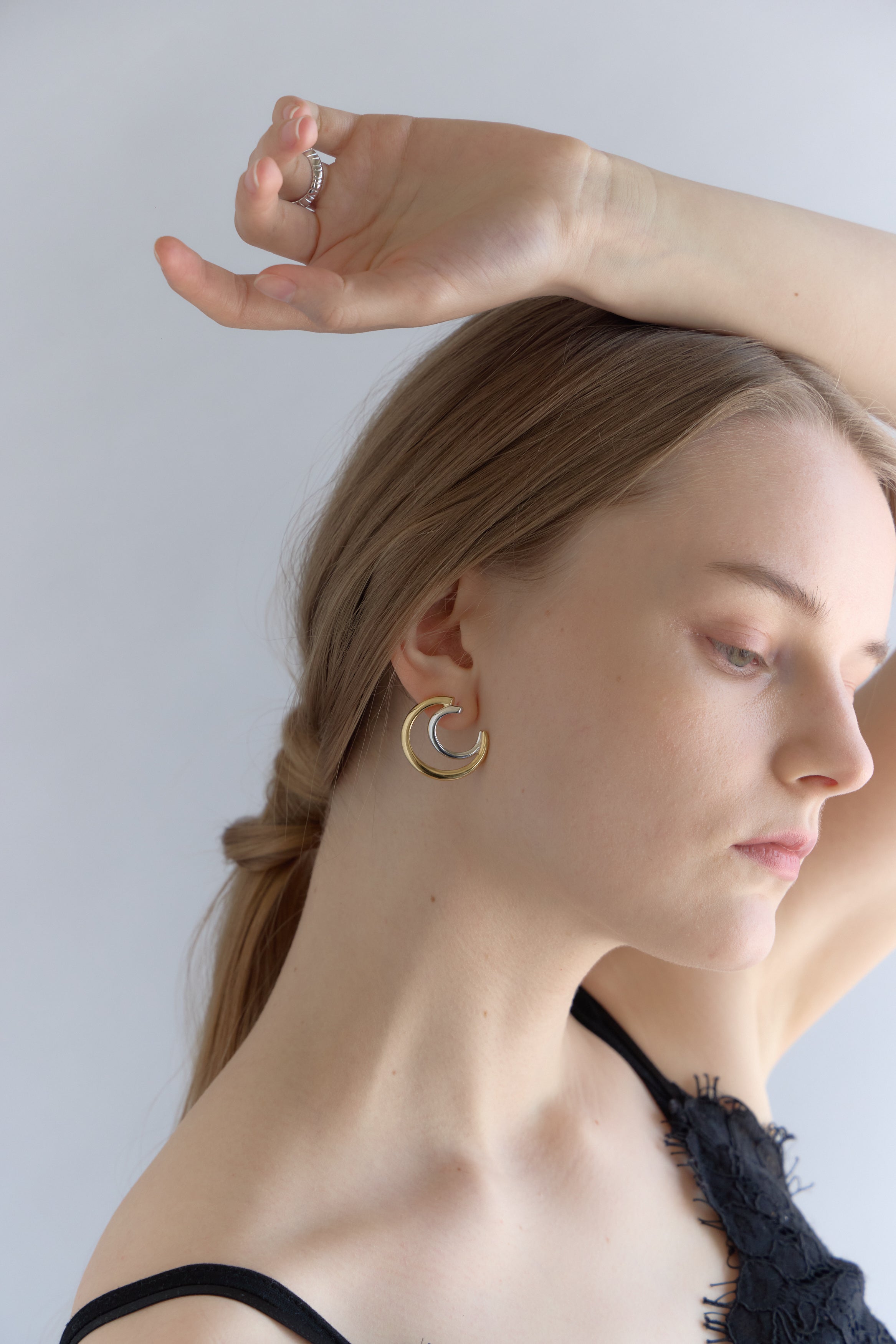 These three-dimensional earrings feature two beautifully overlapping gold and silver lines, and are just the right size at approximately 3cm, with an exquisite balance that makes them eye-catching yet never heavy.