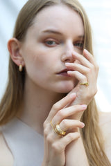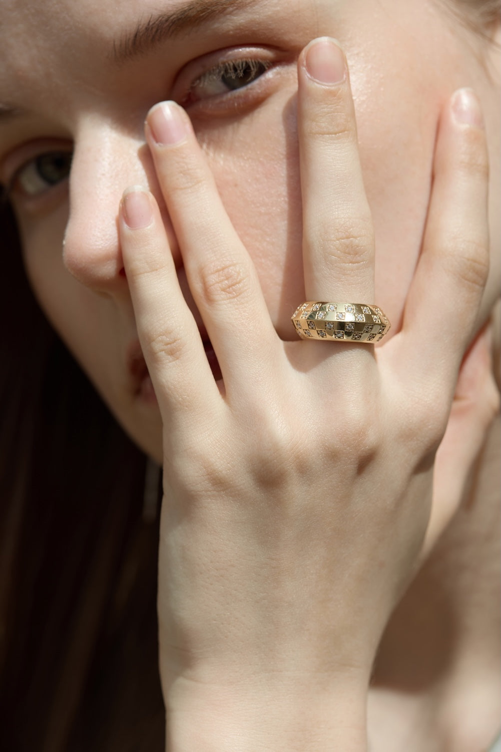 A voluminous ring with a lattice design that combines a structured form with an inorganic sparkle.