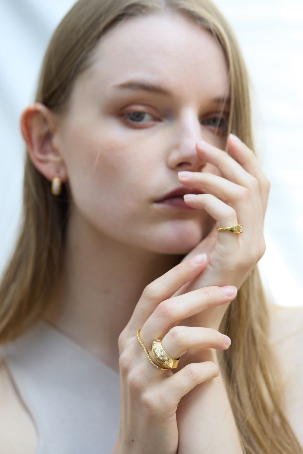The design features an edgy, three-dimensional silhouette and a balanced grid of crystals, creating a presence that quietly exudes strength.