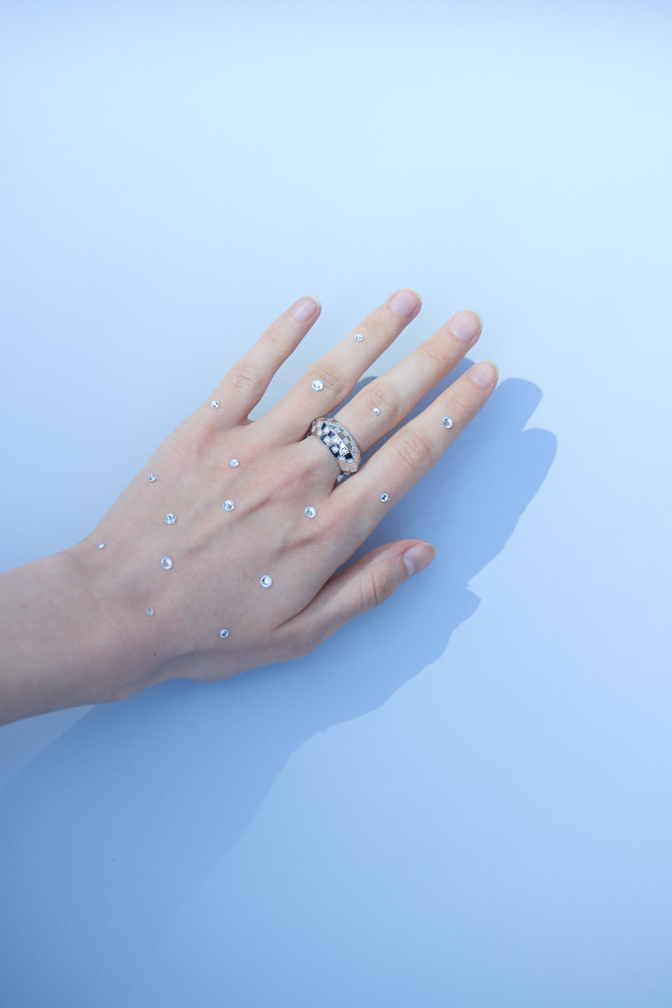 The design features an edgy, three-dimensional silhouette and a balanced grid of crystals, creating a presence that quietly exudes strength.