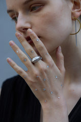 A voluminous ring with a lattice design that combines a structured form with an inorganic sparkle.