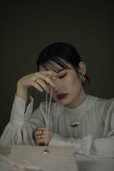ビーンズモチーフのネックレスは長さ約40cm。ミドルな長さでコーディネートをスタイリッシュに仕上げてくれます。大きめのモチーフはポイントになりつつ、いびつな表面でデザインされており、女性らしいやわらかい雰囲気を残したシルエット。チェーンはシルバー925のスクリューチェーンを使用。クールでモードなスタイリングにもオススメです。