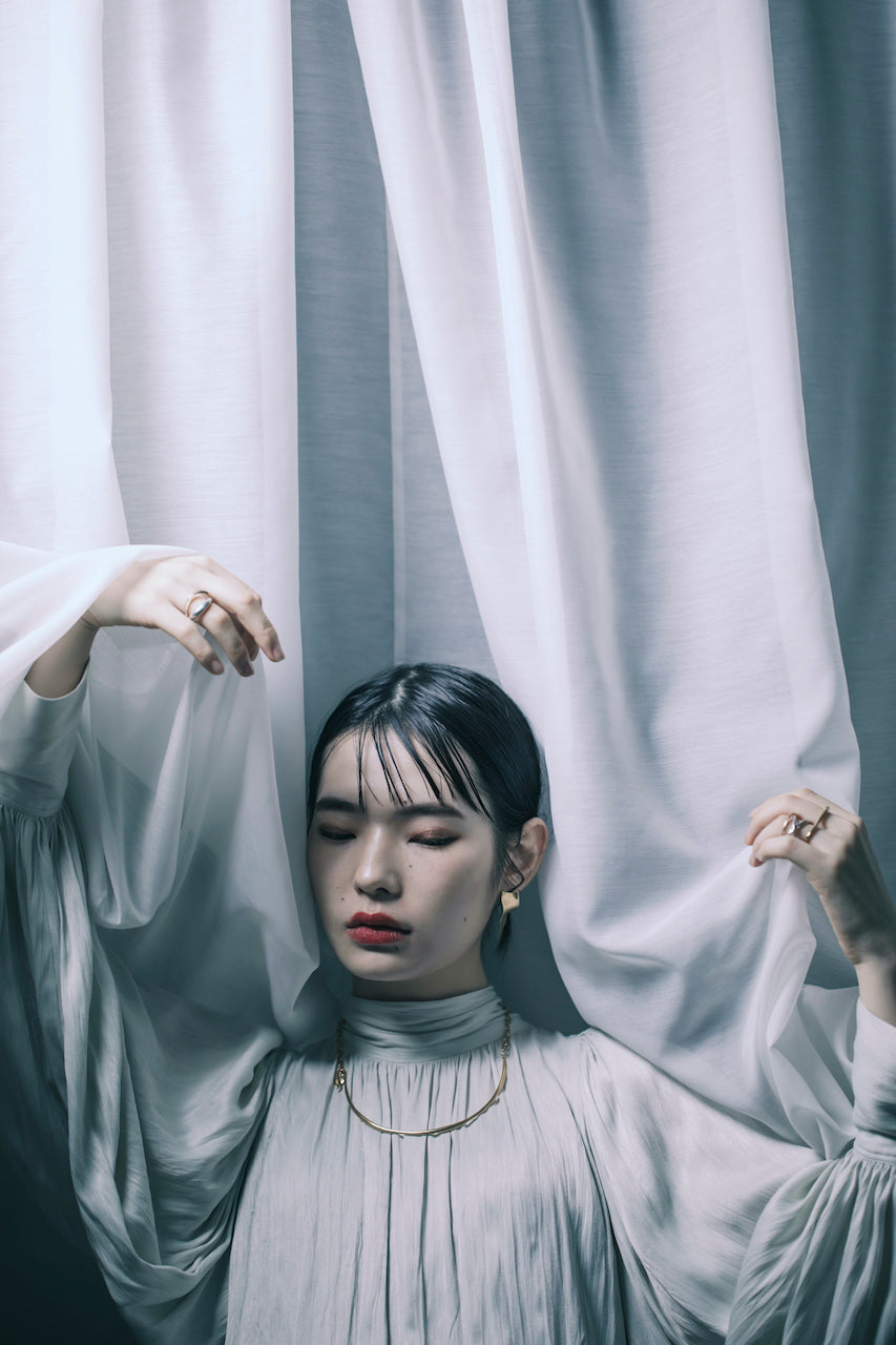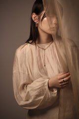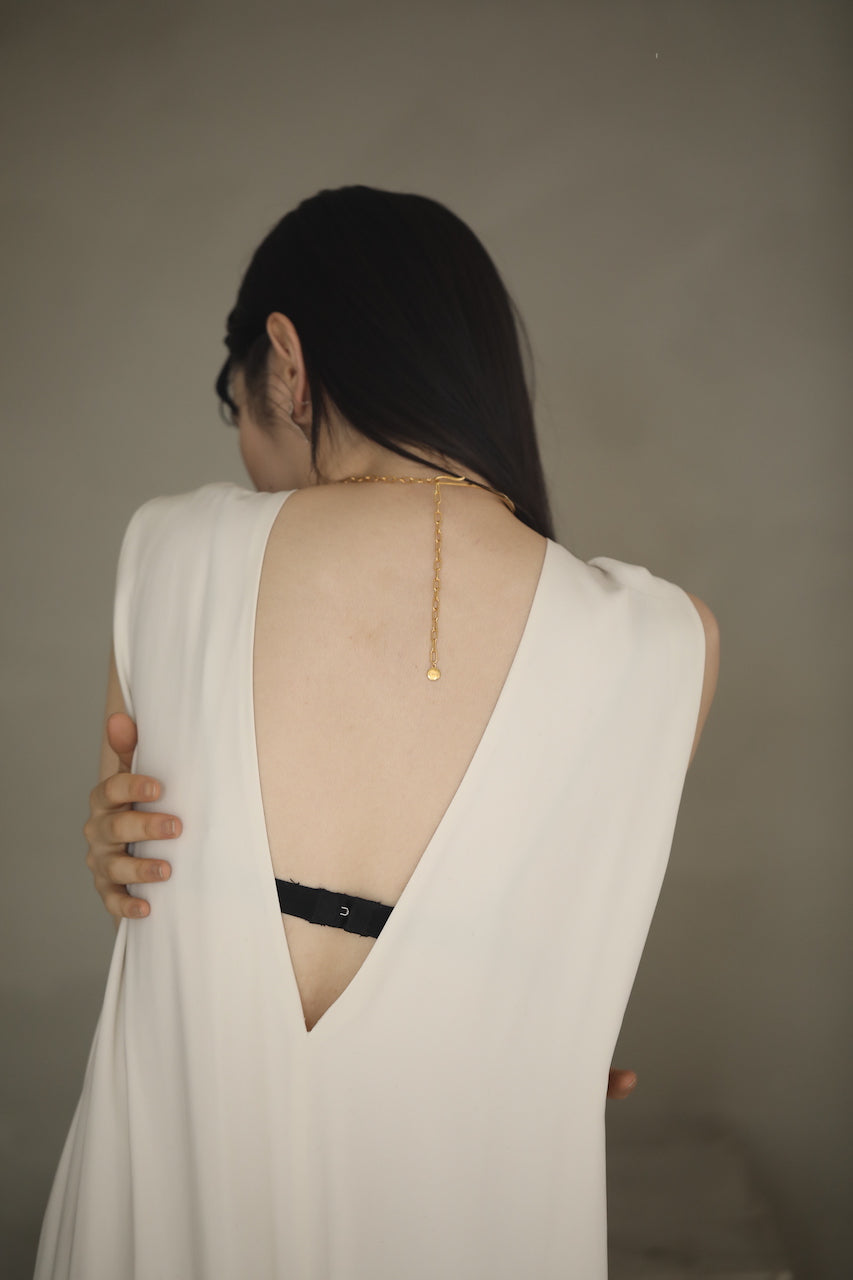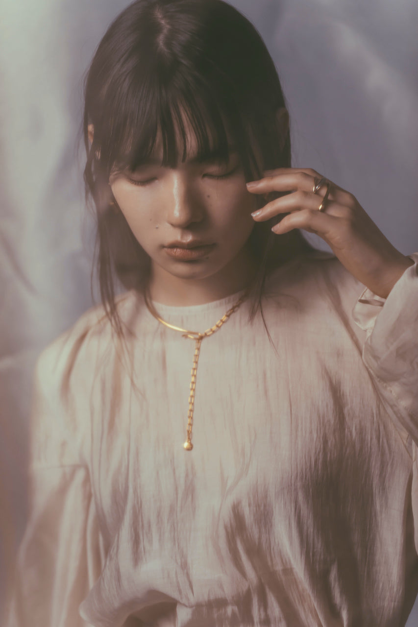 チェーンを前に垂らし、チョーカーとハーフでご着用いただいたり、チェーンをフロントに持ってくるなど、さまざまなコーディネートの仕方もお楽しみいただけます。