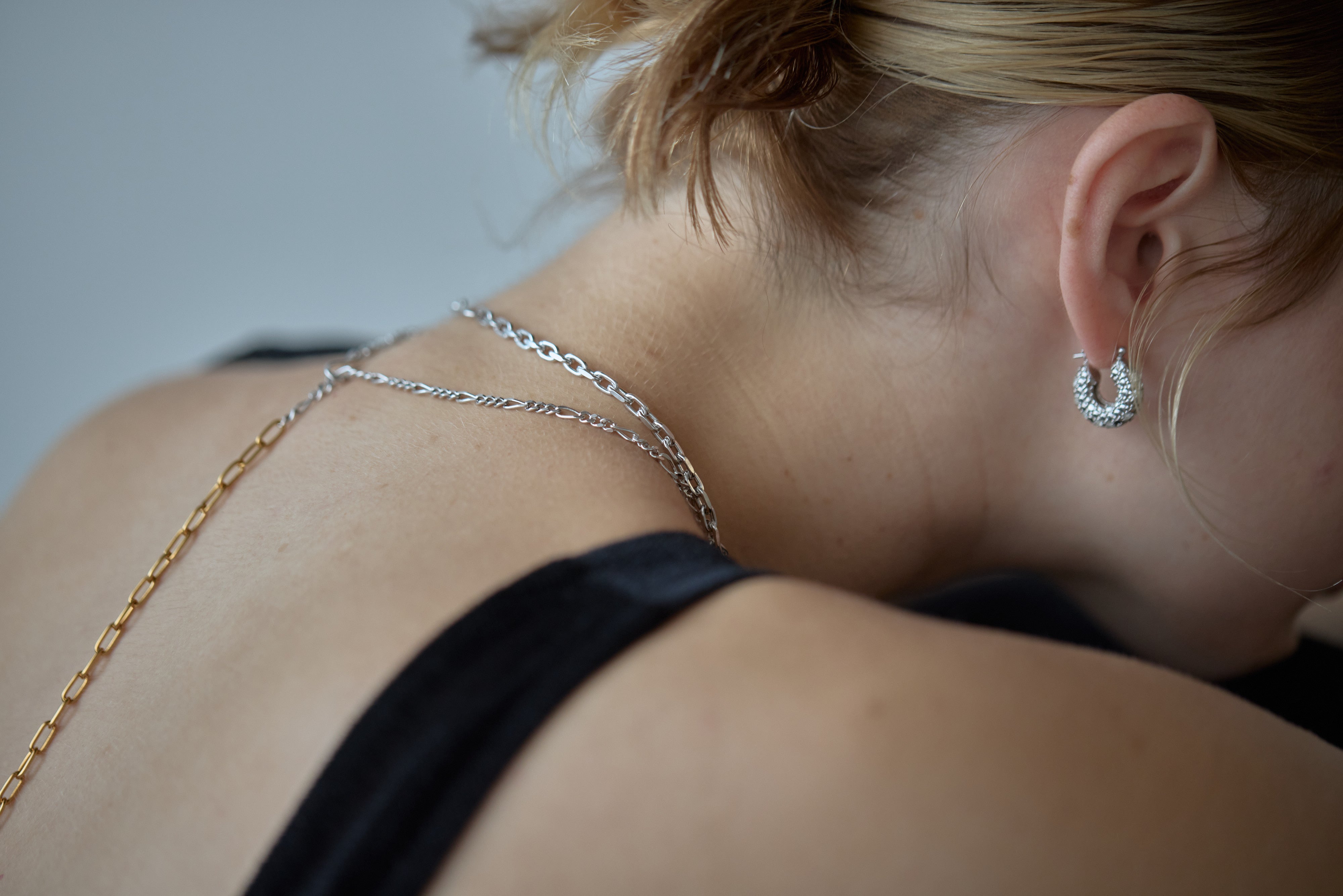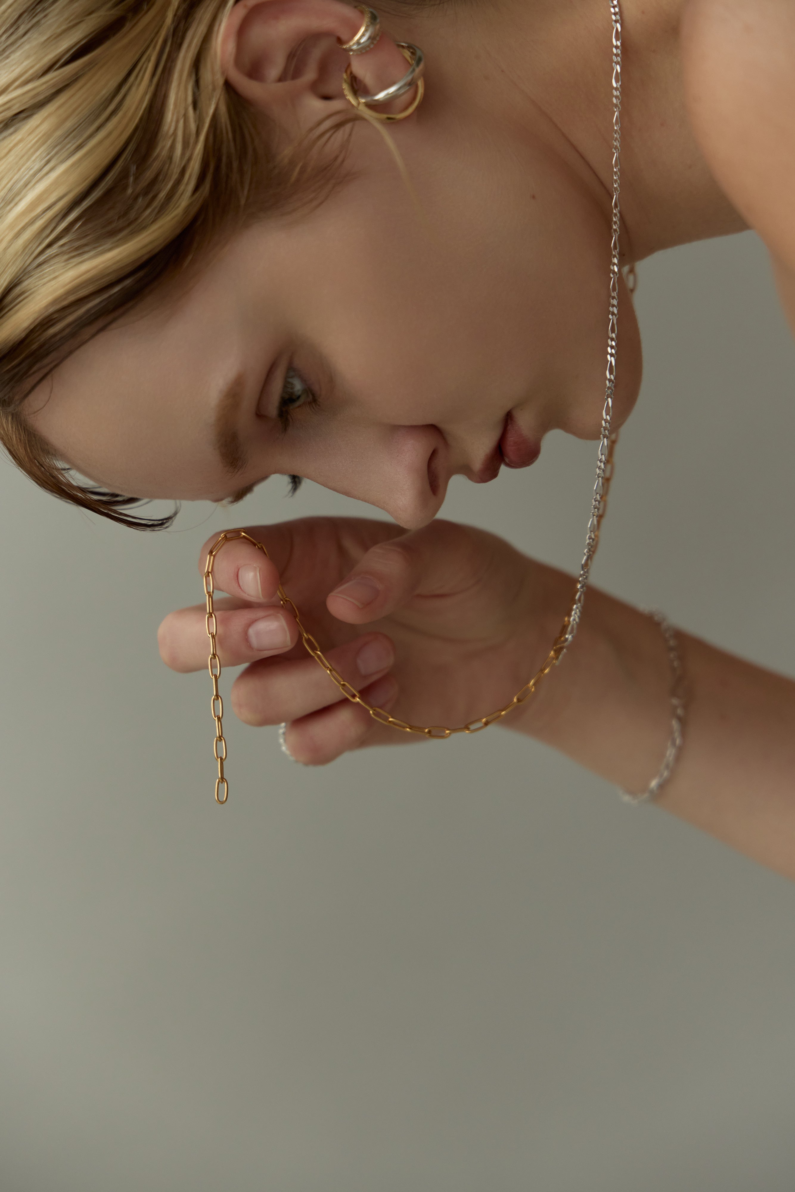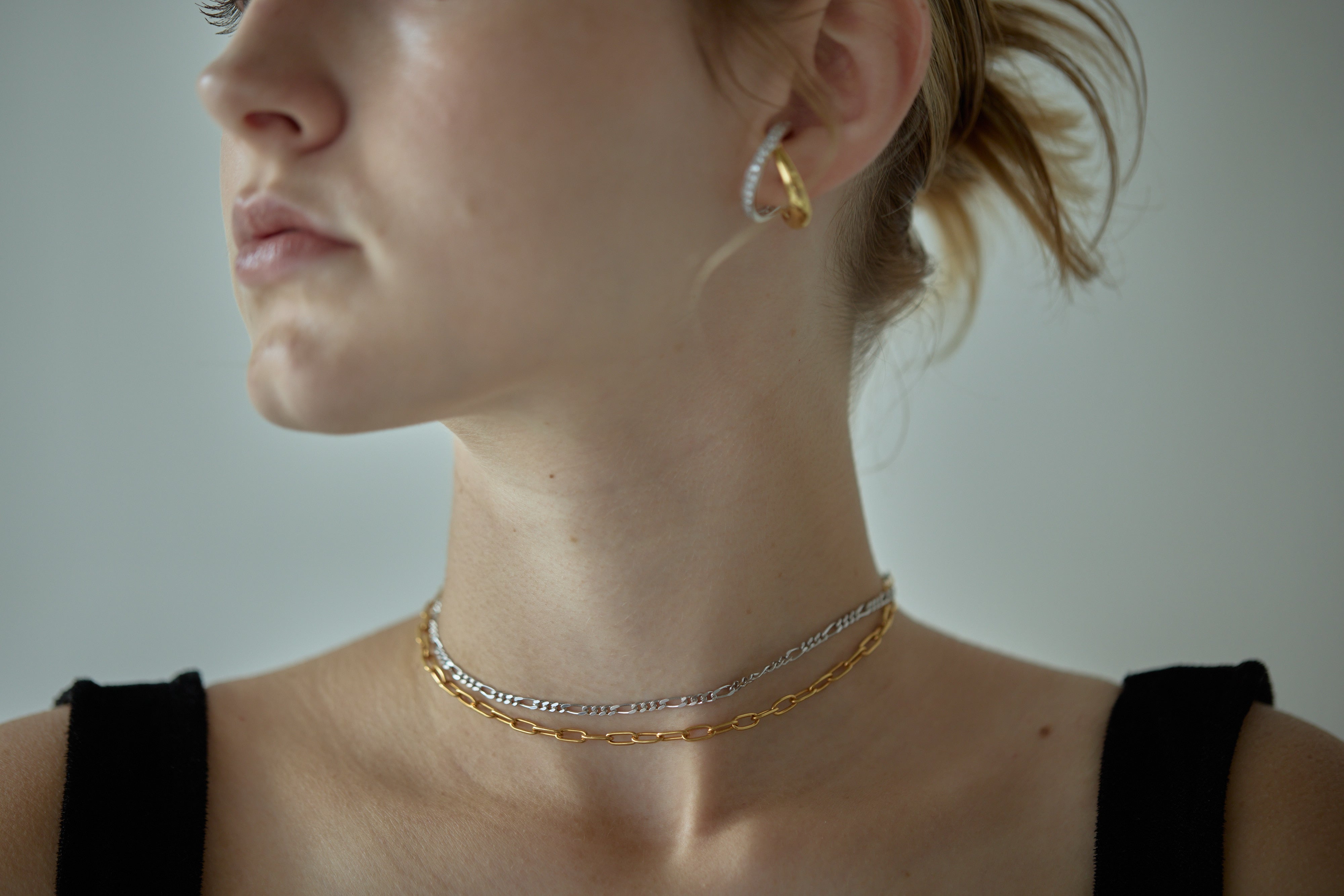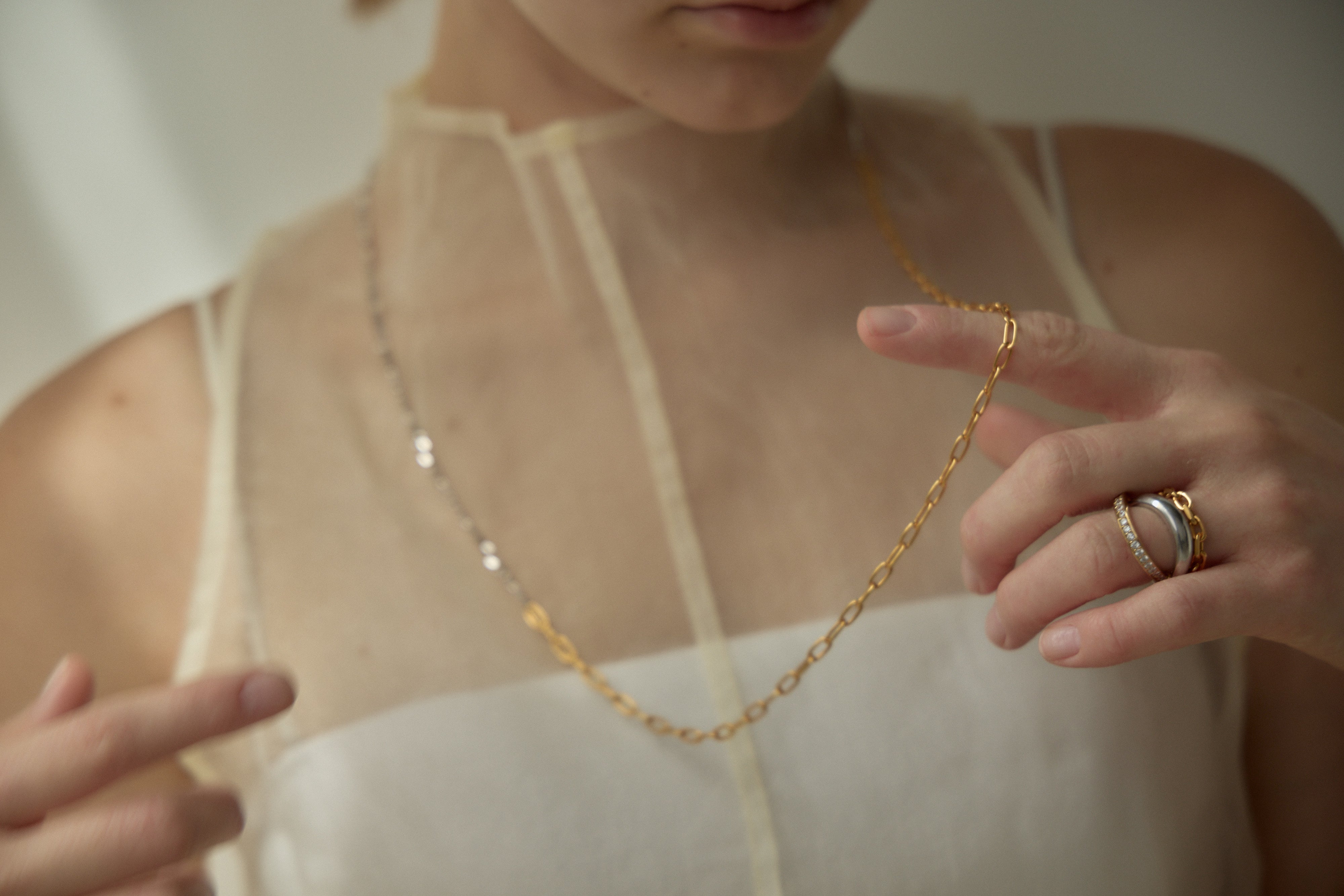 シルバーとゴールドが織りなすコントラストが、スタイリングに