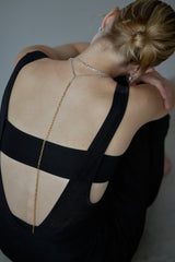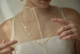 ラリエット風に垂らしたり、二重に着用するなど、シンプルなスタイリングだけでなく印象の異なるバランスを楽しめるデザイン。