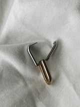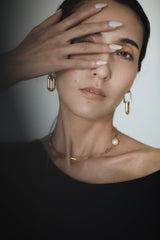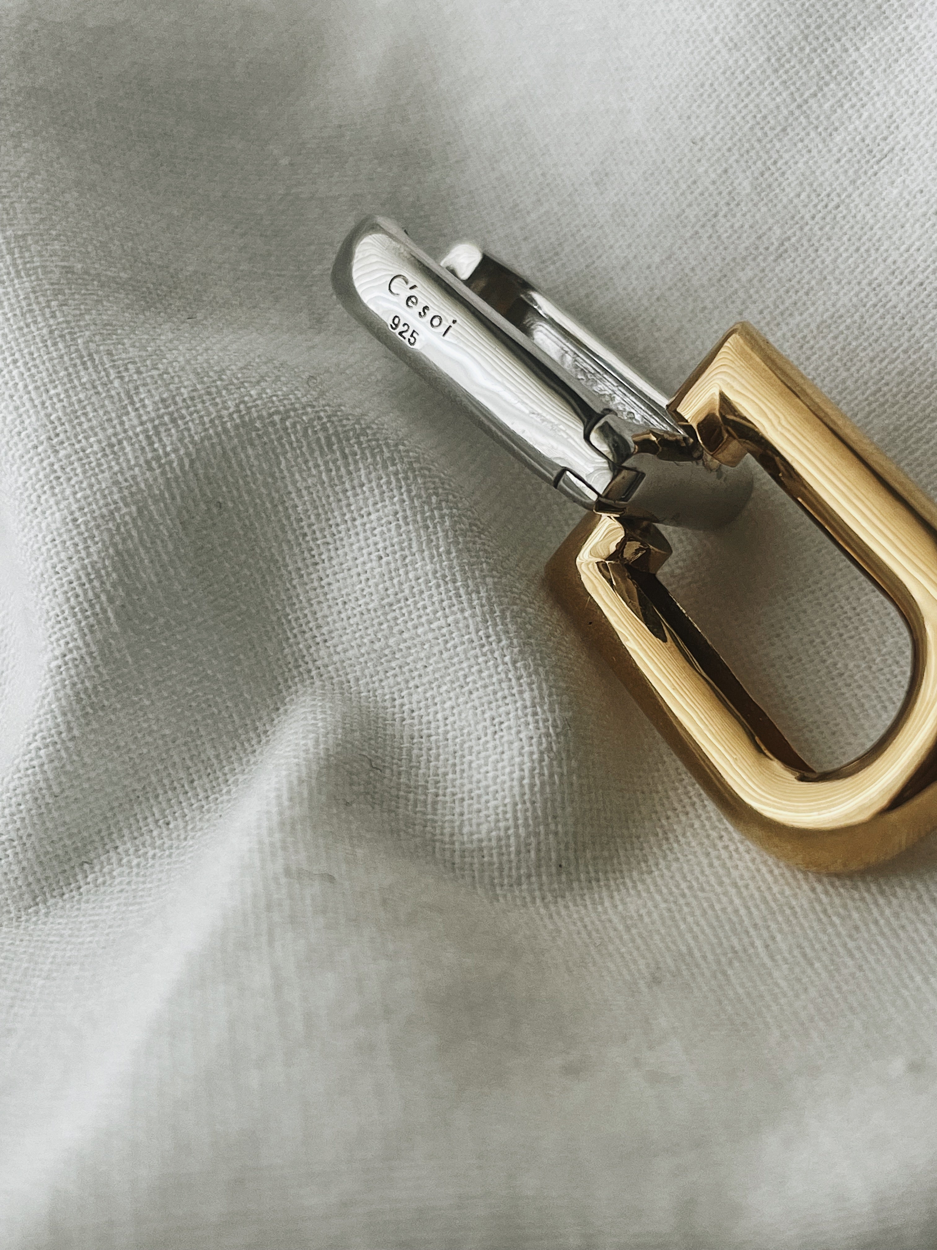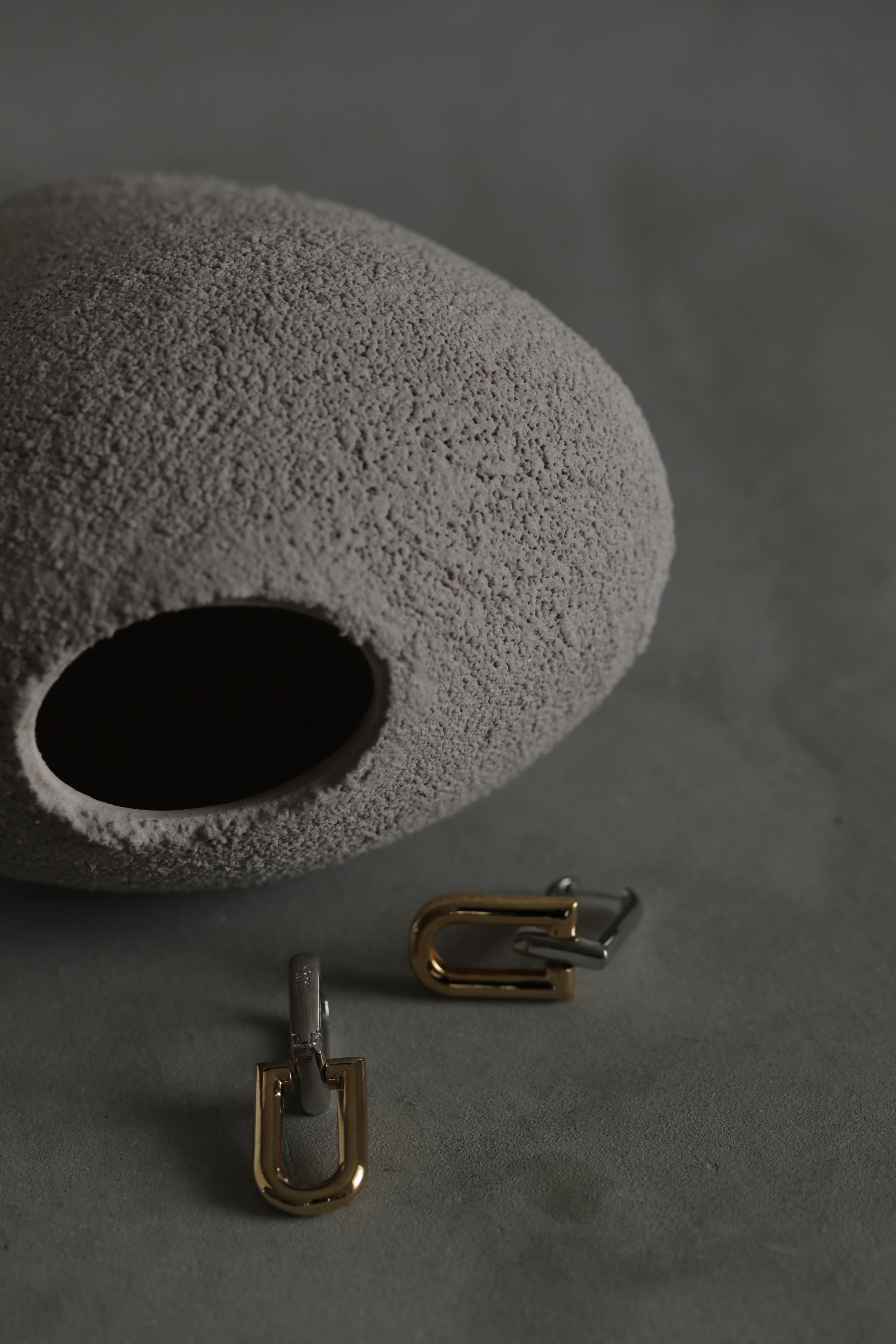 存在感のあるシルエットながら下のパーツは繊細に前後に揺れるピアスです。