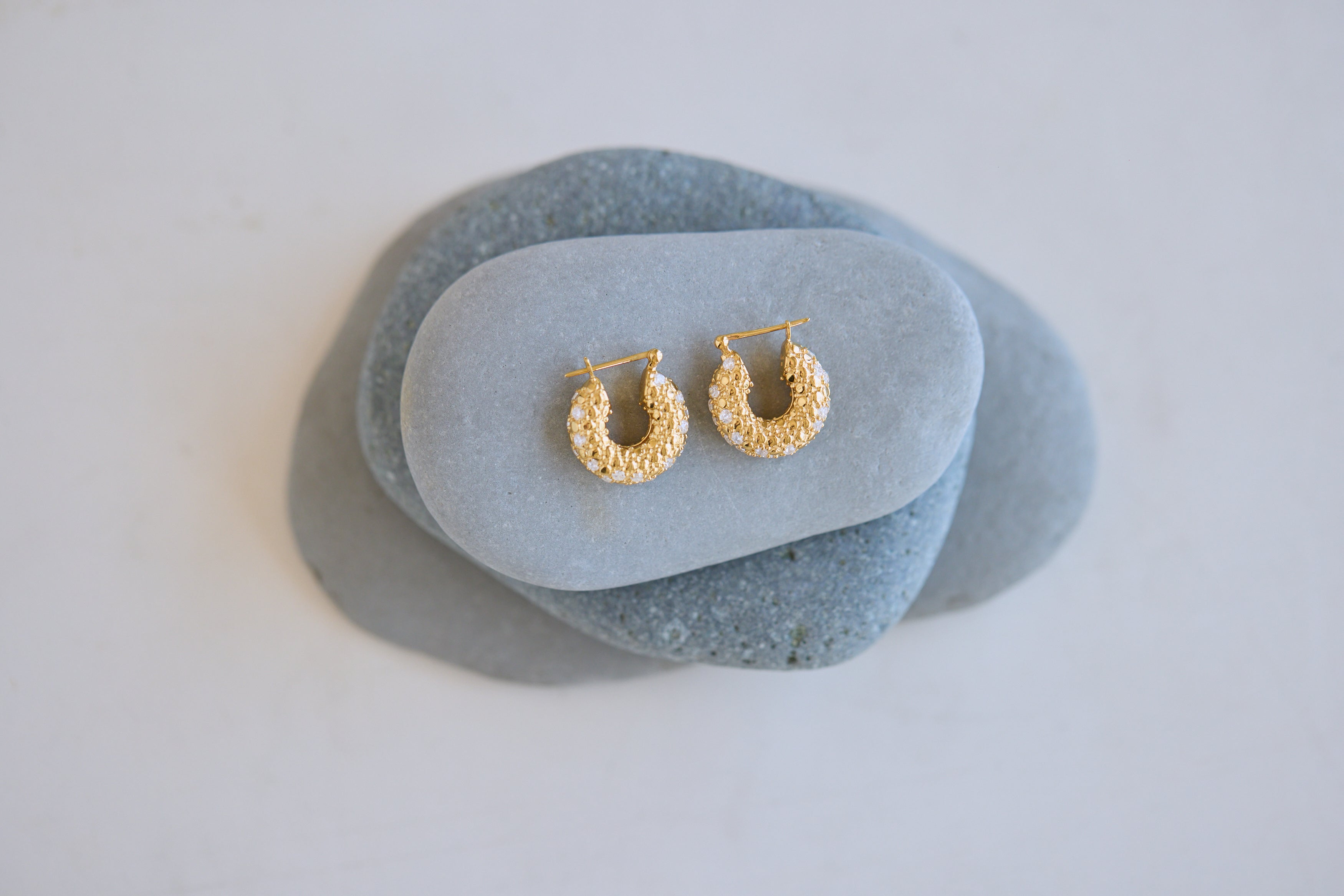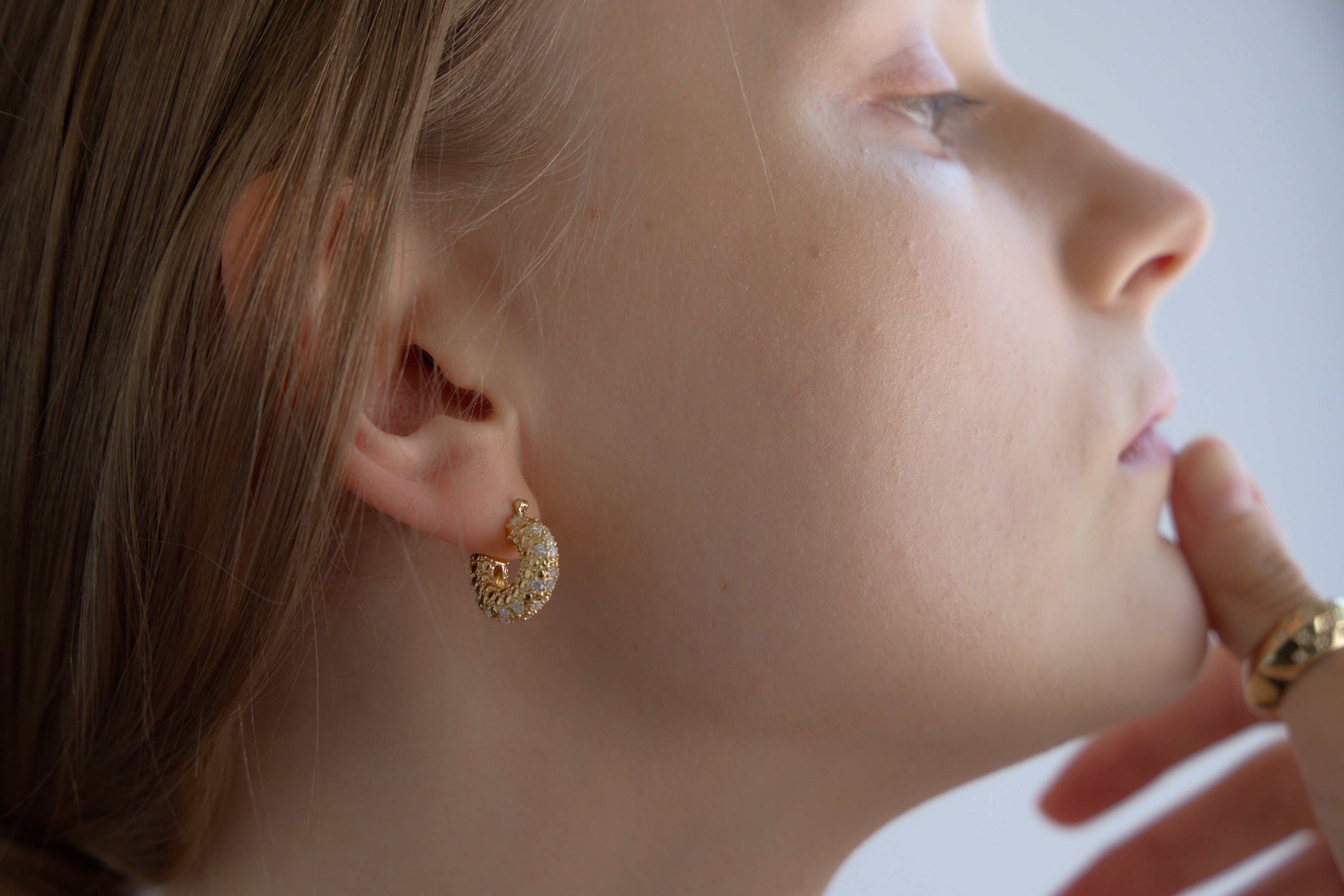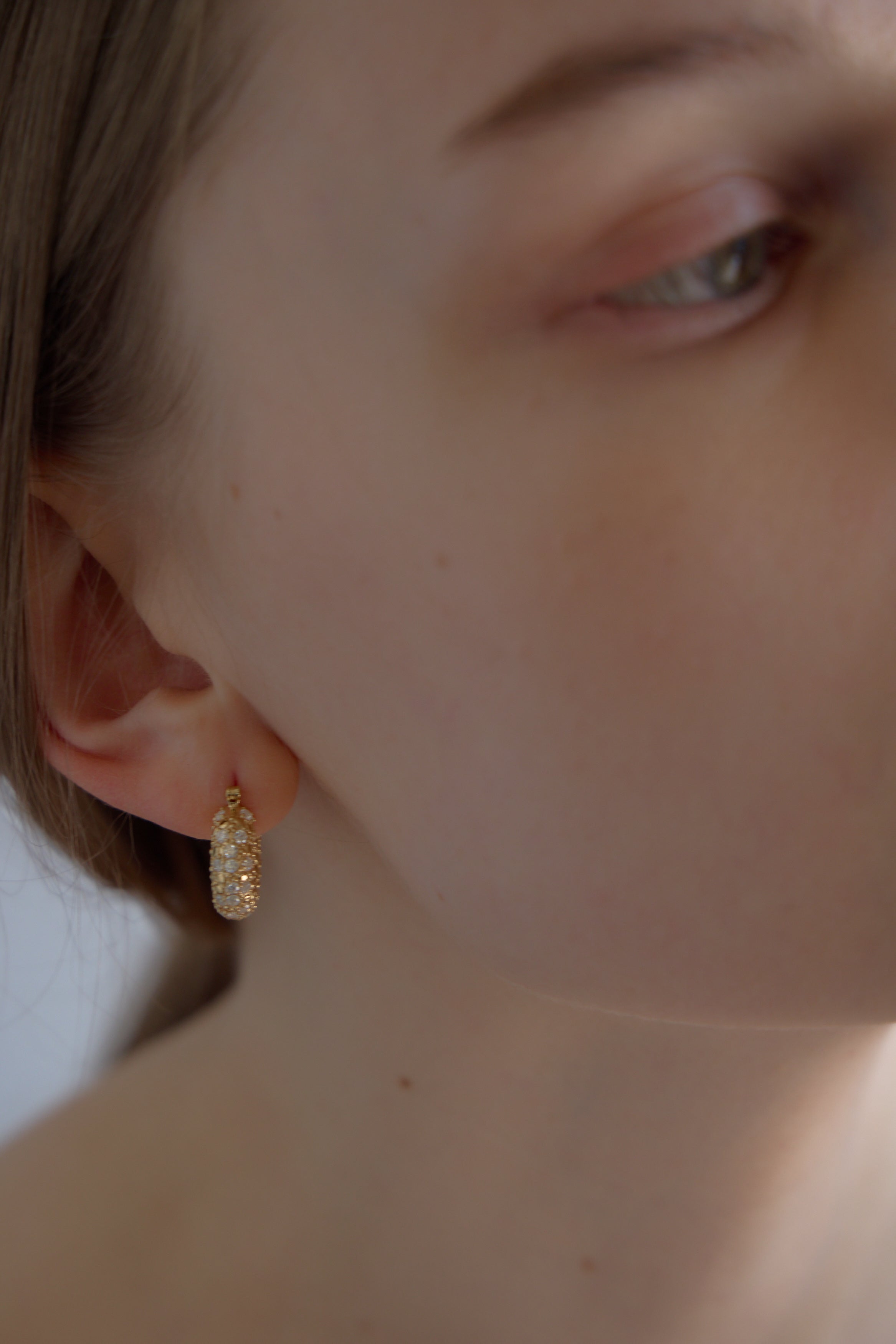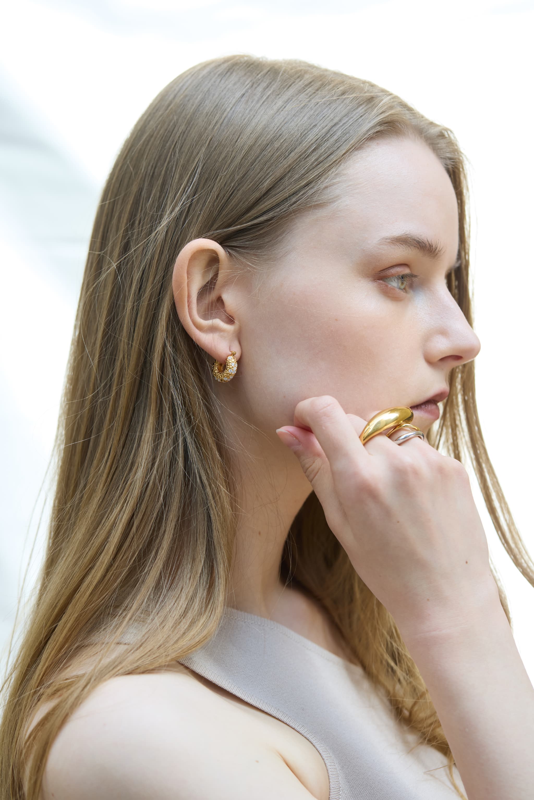Cristal Pavé Hoop Pierceは、凛とした佇まいの中に繊細な職人技が光る、洗練されたシルバーフープピアスです。表面にあしらわれた無数のパヴェ状テクスチャーが、光を受けてまばゆい輝きを放ち、まるで耳元にクリスタルのオーラを纏ったかのような存在感を演出します。