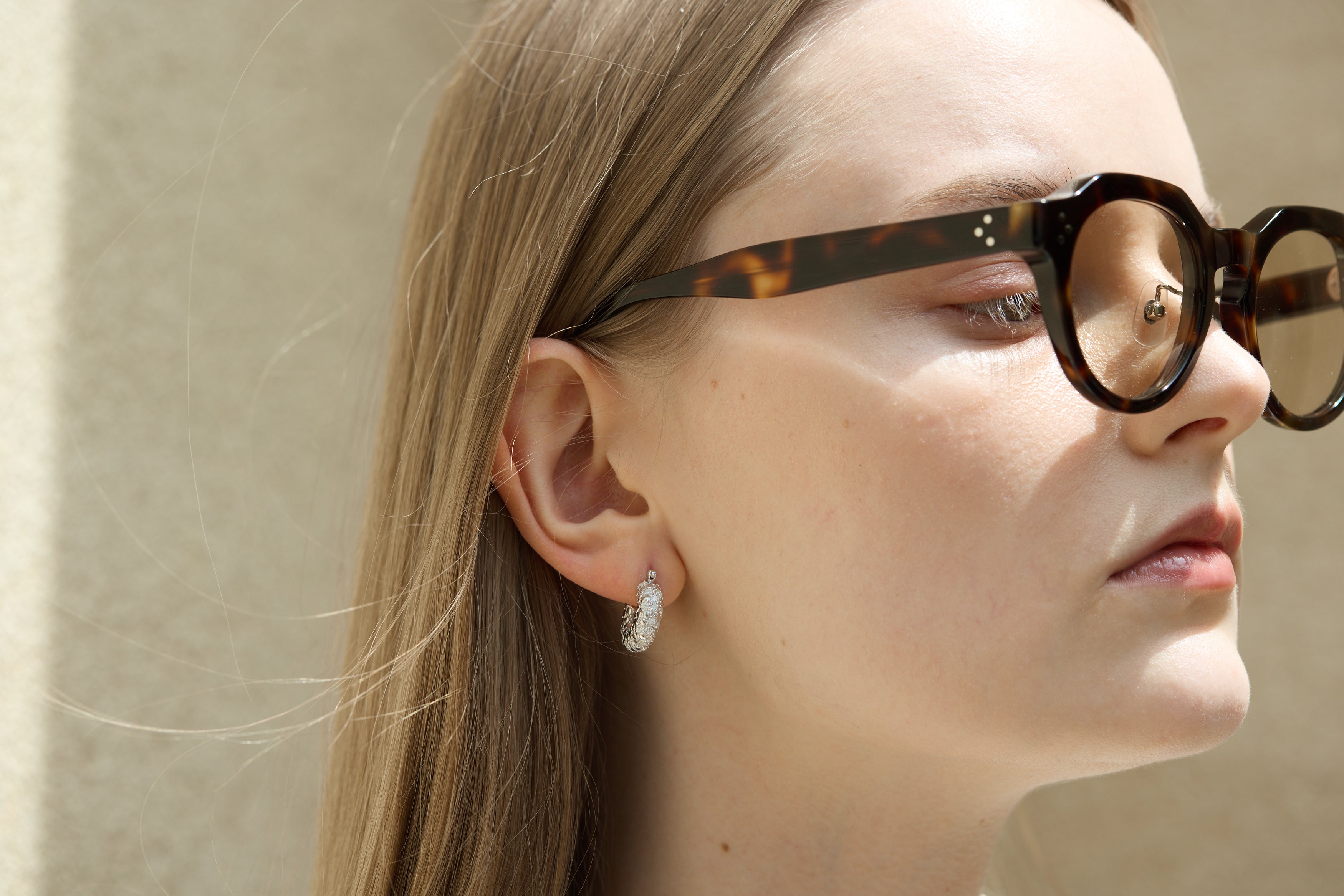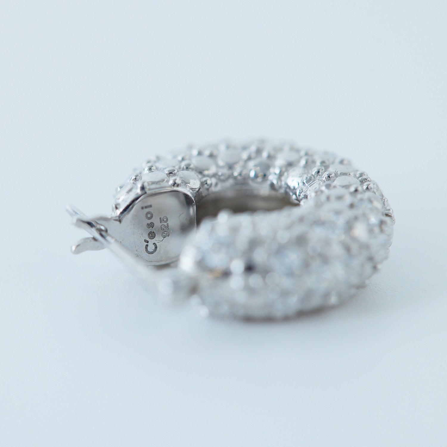 Cristal Pavé Hoop Pierceは、凛とした佇まいの中に繊細な職人技が光る、洗練されたシルバーフープピアスです。表面にあしらわれた無数のパヴェ状テクスチャーが、光を受けてまばゆい輝きを放ち、まるで耳元にクリスタルのオーラを纏ったかのような存在感を演出します。