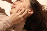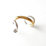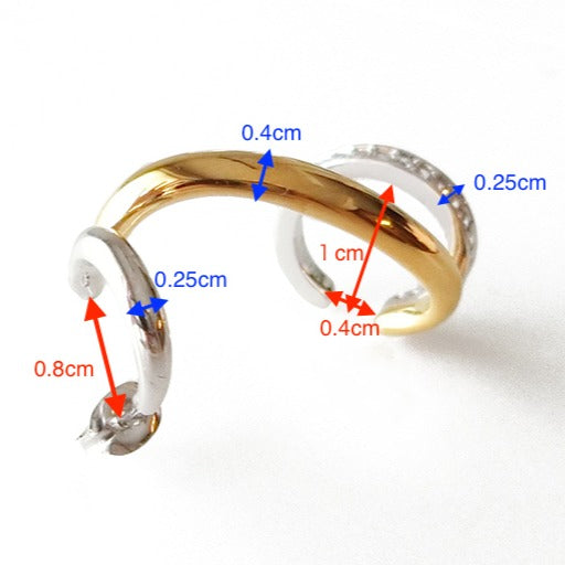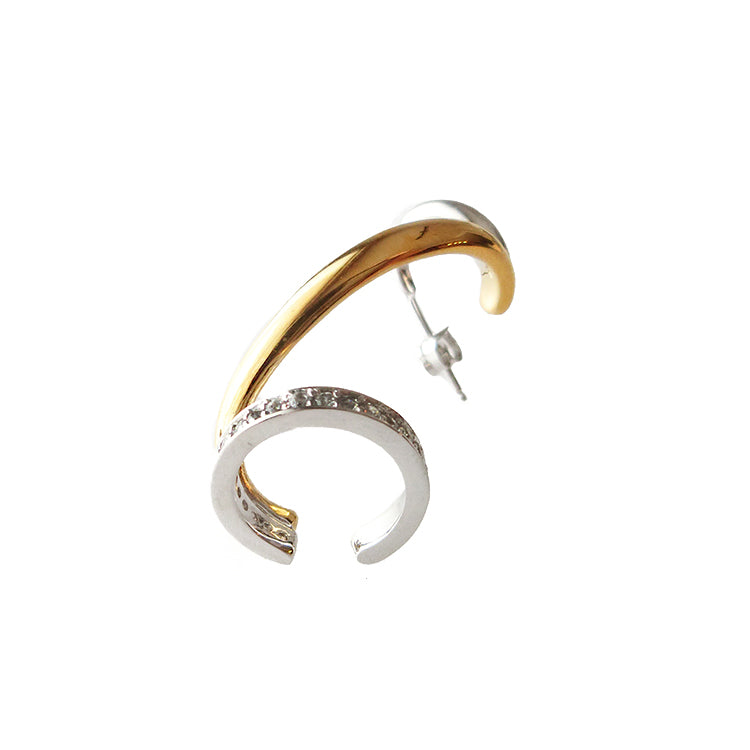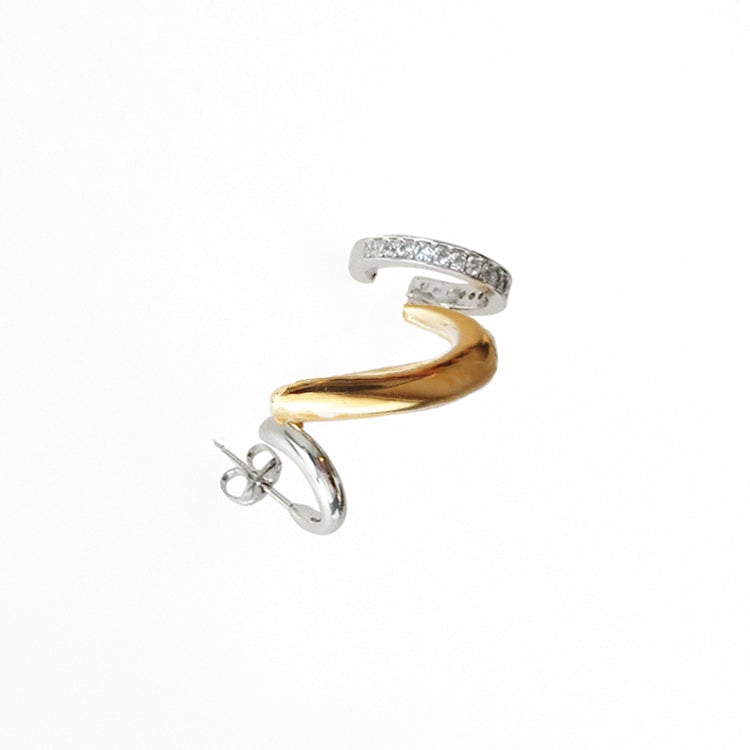 シルバー、ゴールド、クリスタルの3つのパーツが耳元に絡むように彩るスタイリッシュなピアスカフです。