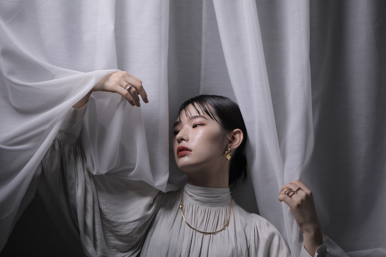 斜めにカットされたデザインはフェイスラインに沿うように着用したり、左右を付け替えていただくことでまたちがった見え方でお楽しみいただけます。