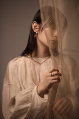 斜めにカットされたデザインはフェイスラインに沿うように着用したり、左右を付け替えていただくことでまたちがった見え方でお楽しみいただけます。