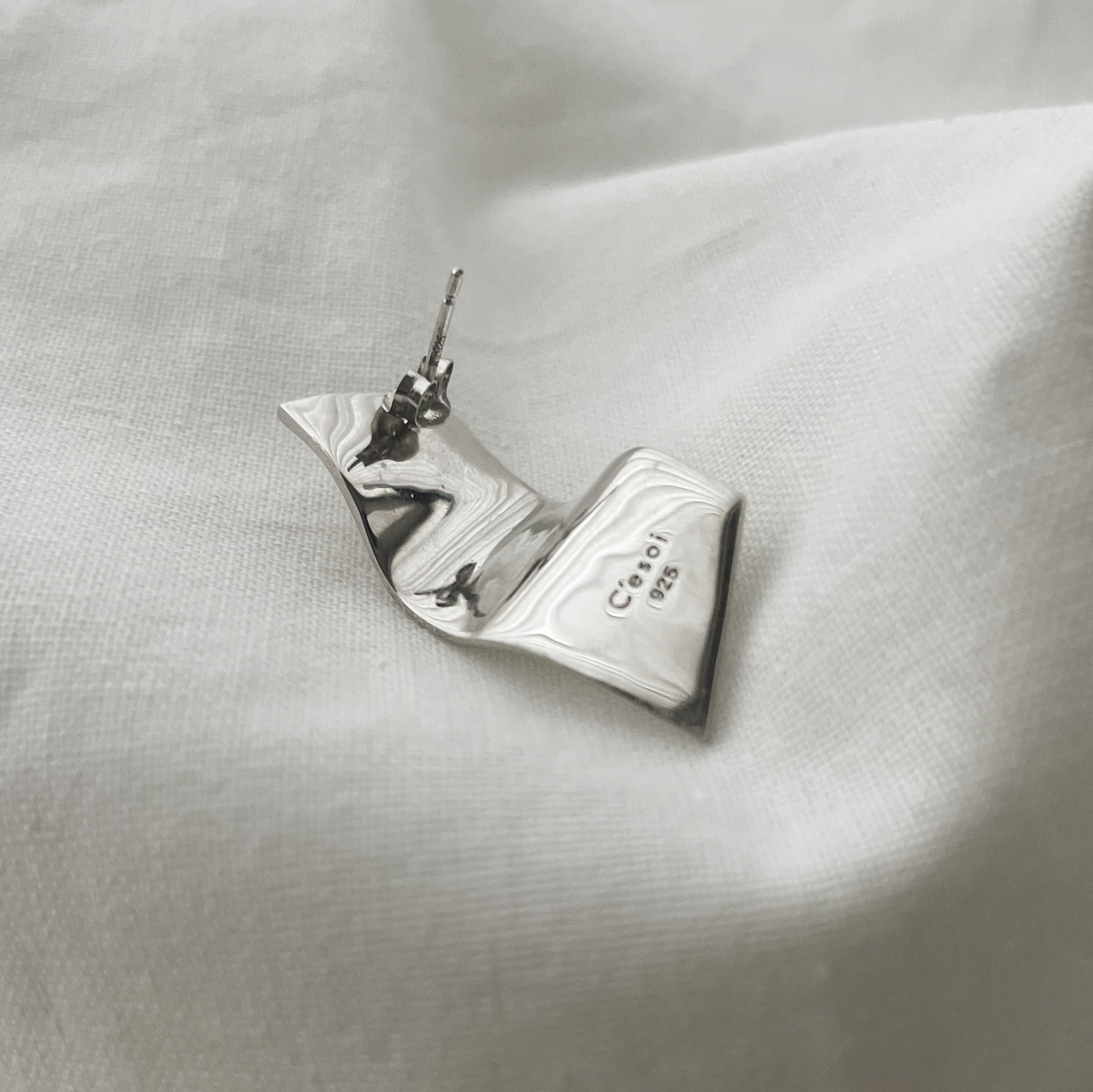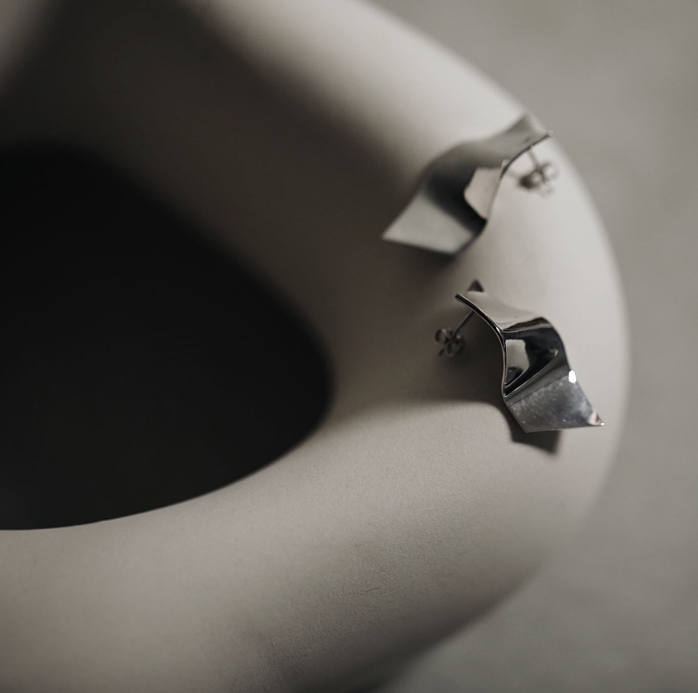クールな印象のプレートピアスをいびつなカービングでデザインし、曲線で表現される女性らしさを残したピアスイヤリング。