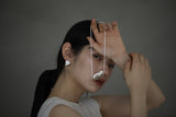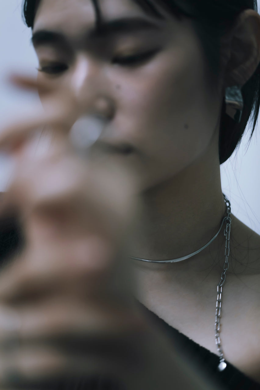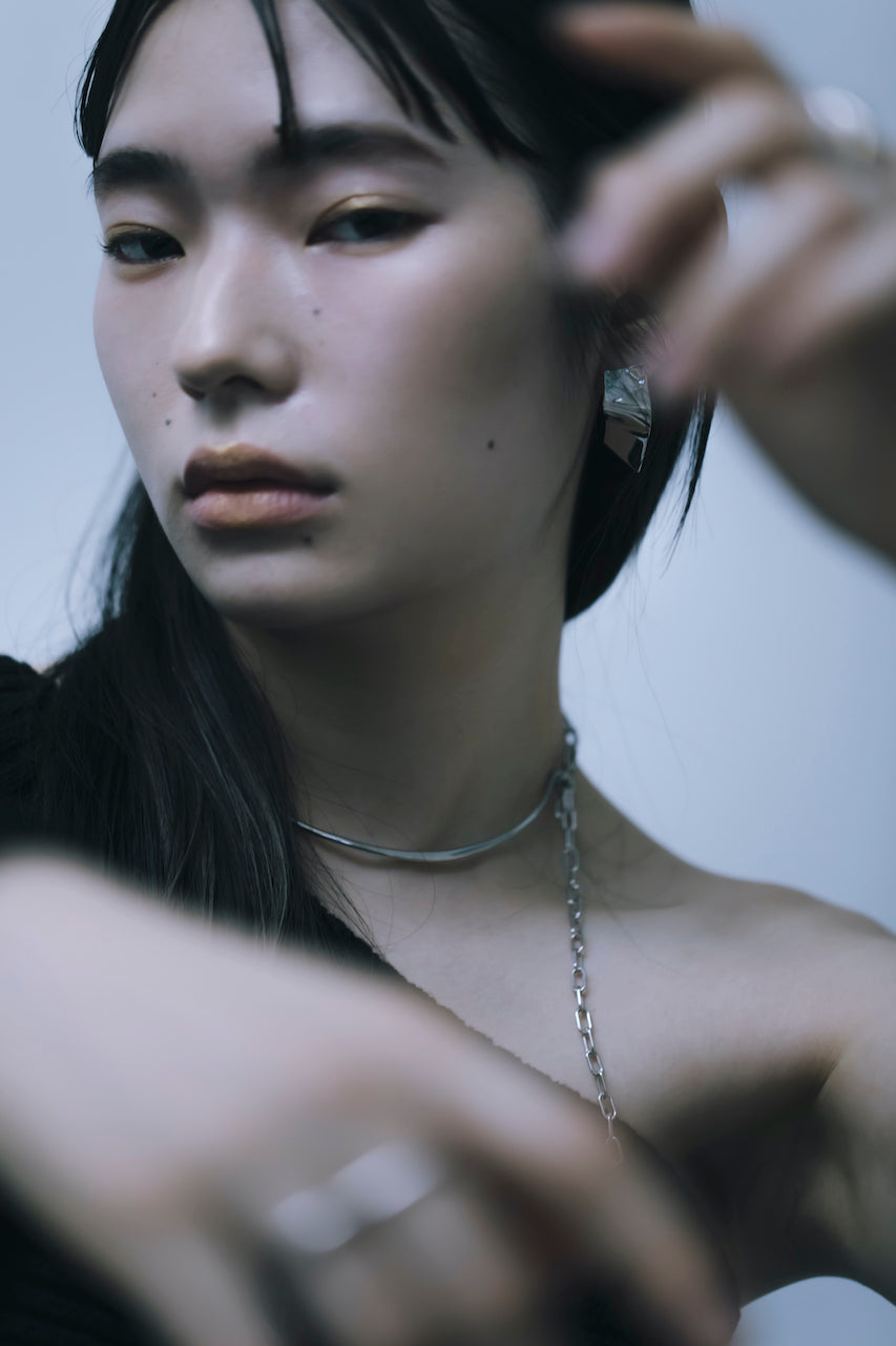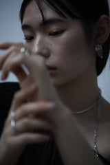 斜めにカットされたデザインはフェイスラインに沿うように着用したり、左右を付け替えていただくことでまたちがった見え方でお楽しみいただけます。