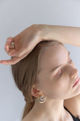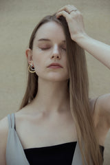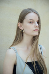 ゴールドとシルバーの2つのラインが美しく重なる、立体的なピアスは約3cmの程よいサイズ感で、存在感はありつつも決して重たくならない絶妙なバランスが魅力です。