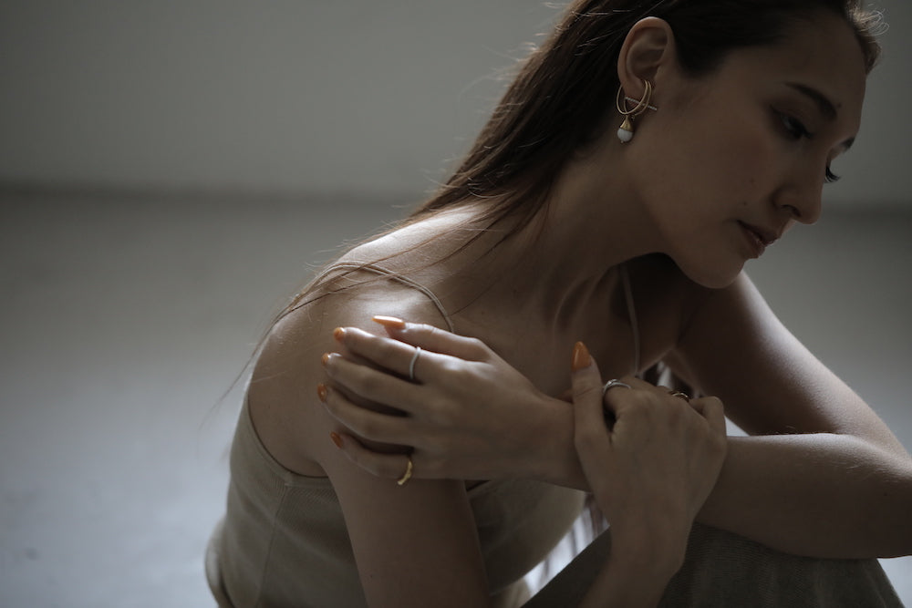 丸みを帯びつつもなだらかなカーブのキャップは、大人の女性でも着けやすいフォルムで、締りのある天然石のカラーが耳元をスタイリッッシュに彩ります。