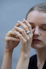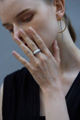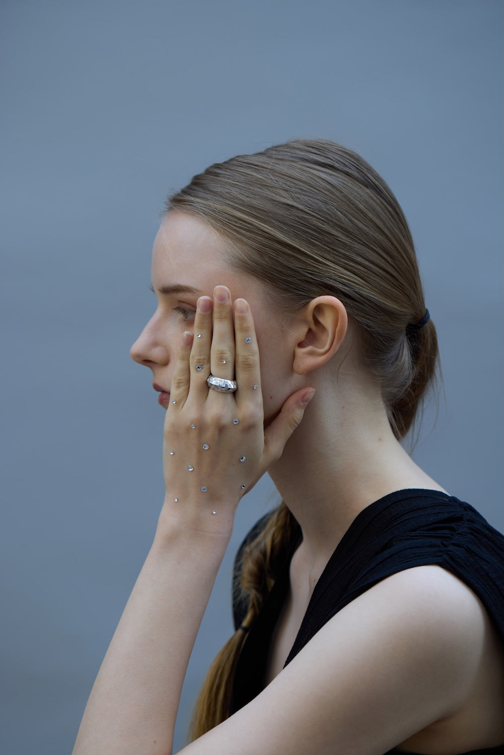 構築的なフォルムと無機質な煌めきが交錯する、ラティス(格子状)デザインのボリュームリング。