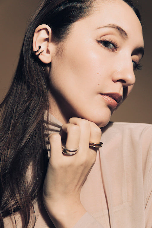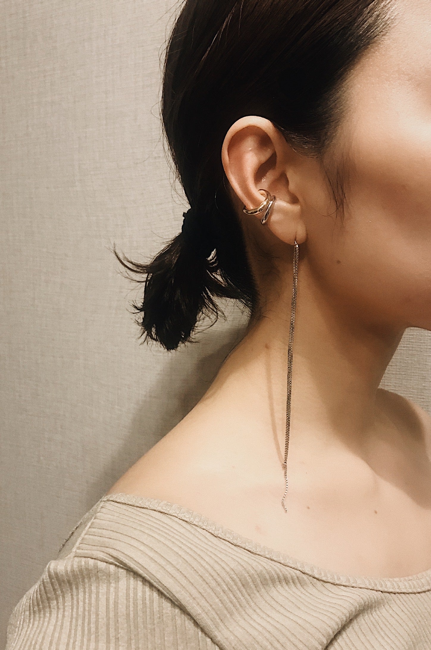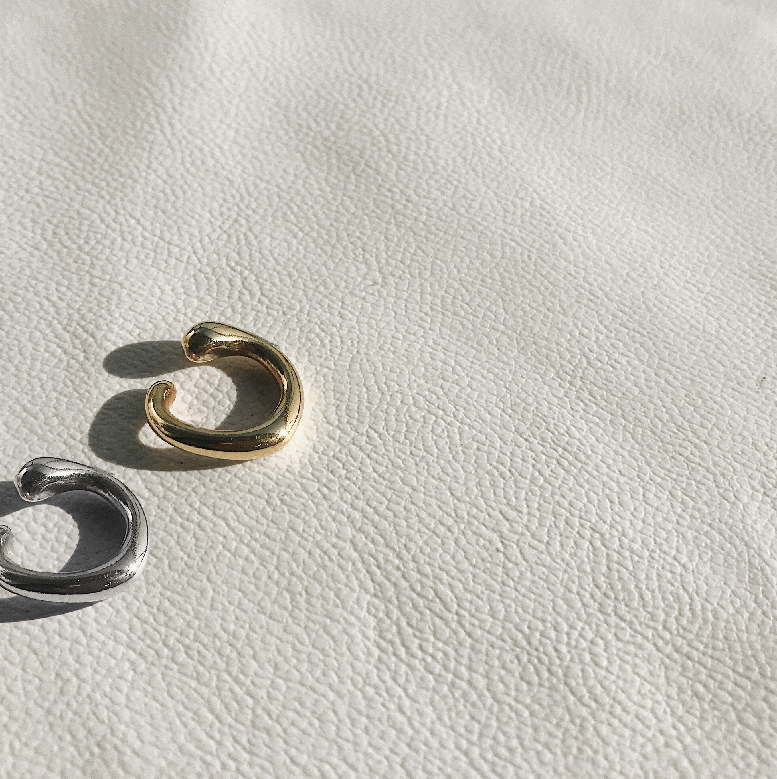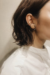 シンプルながらも少しいびつな一癖あるシルエットをしたイヤーカフは、一つでも重ね付けにも大活躍するアイテム。コーディネートにプラスすることで一気にこなれた印象に。