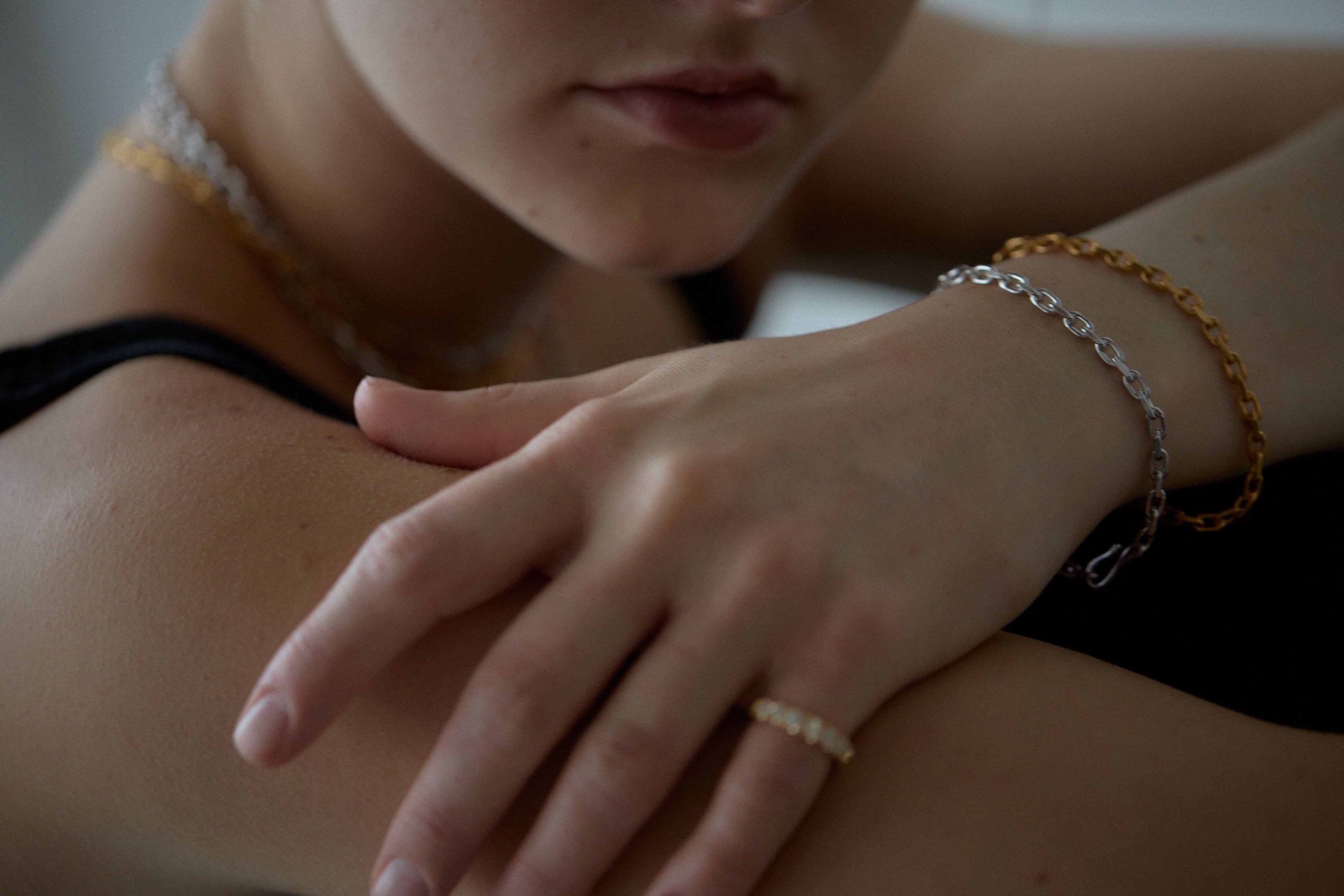 せ持つチェーンが、手元に上品な存在感を添えます。