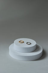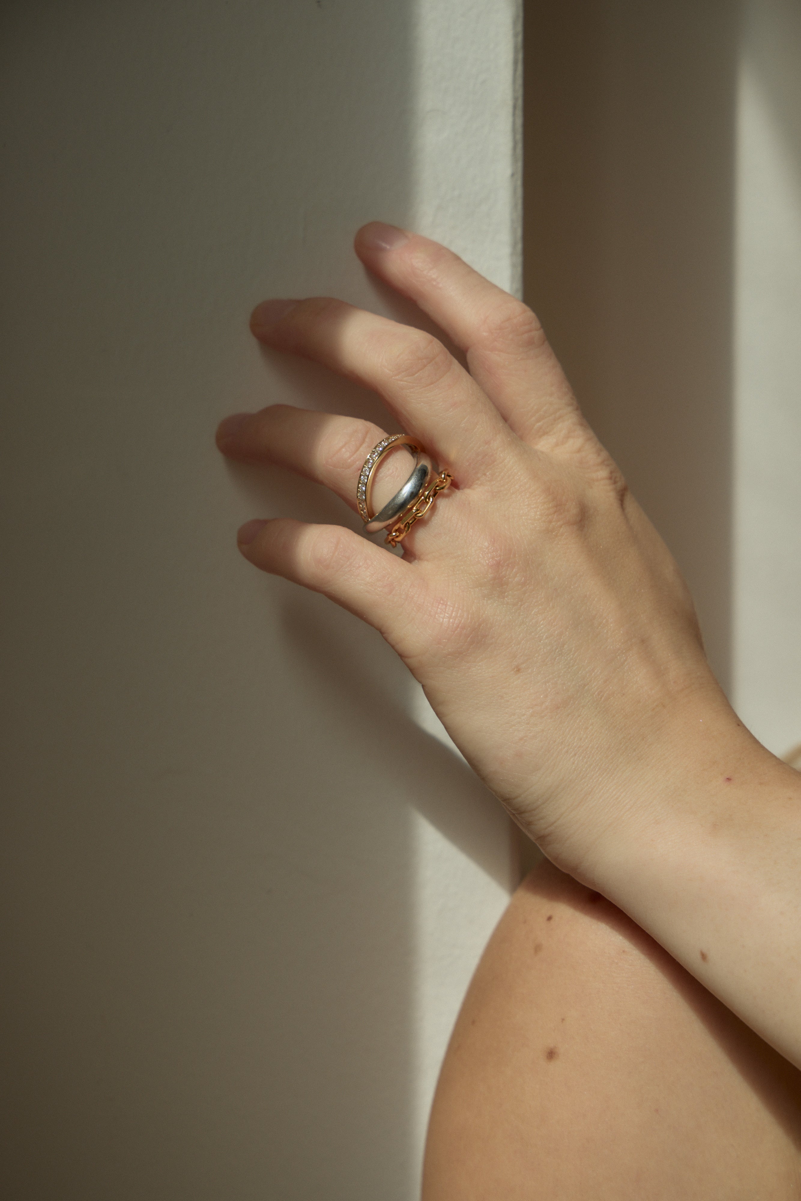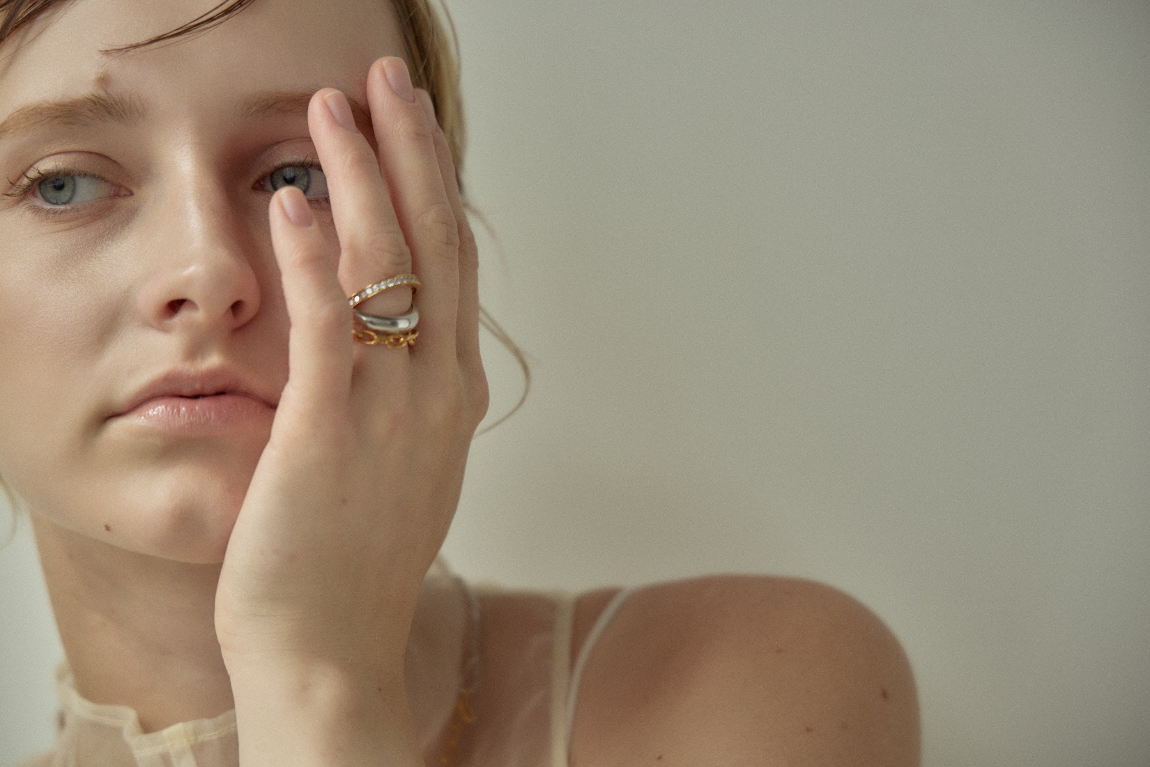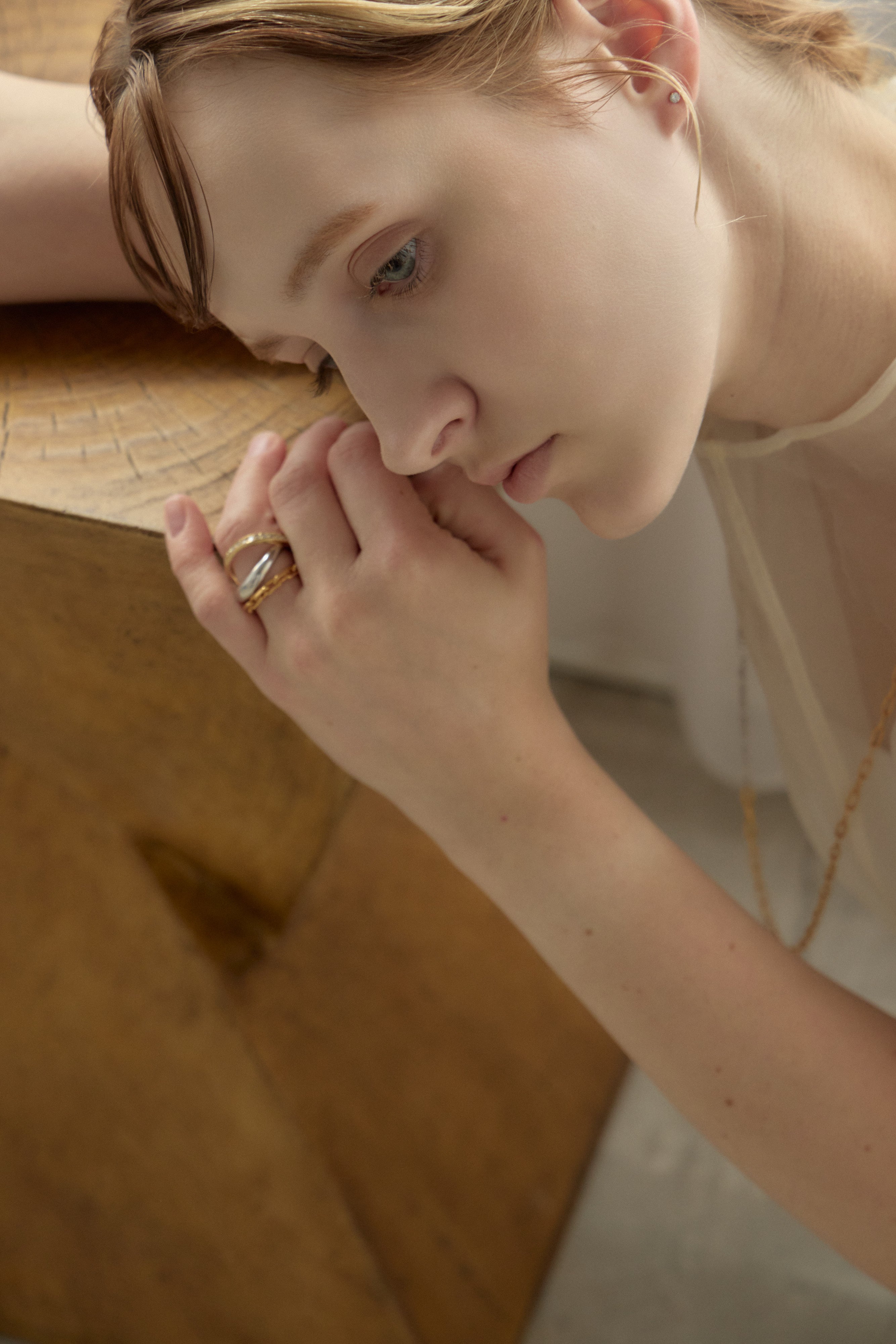 質感やボリュームのリングと重ねることで、より洗練されたスタイリ