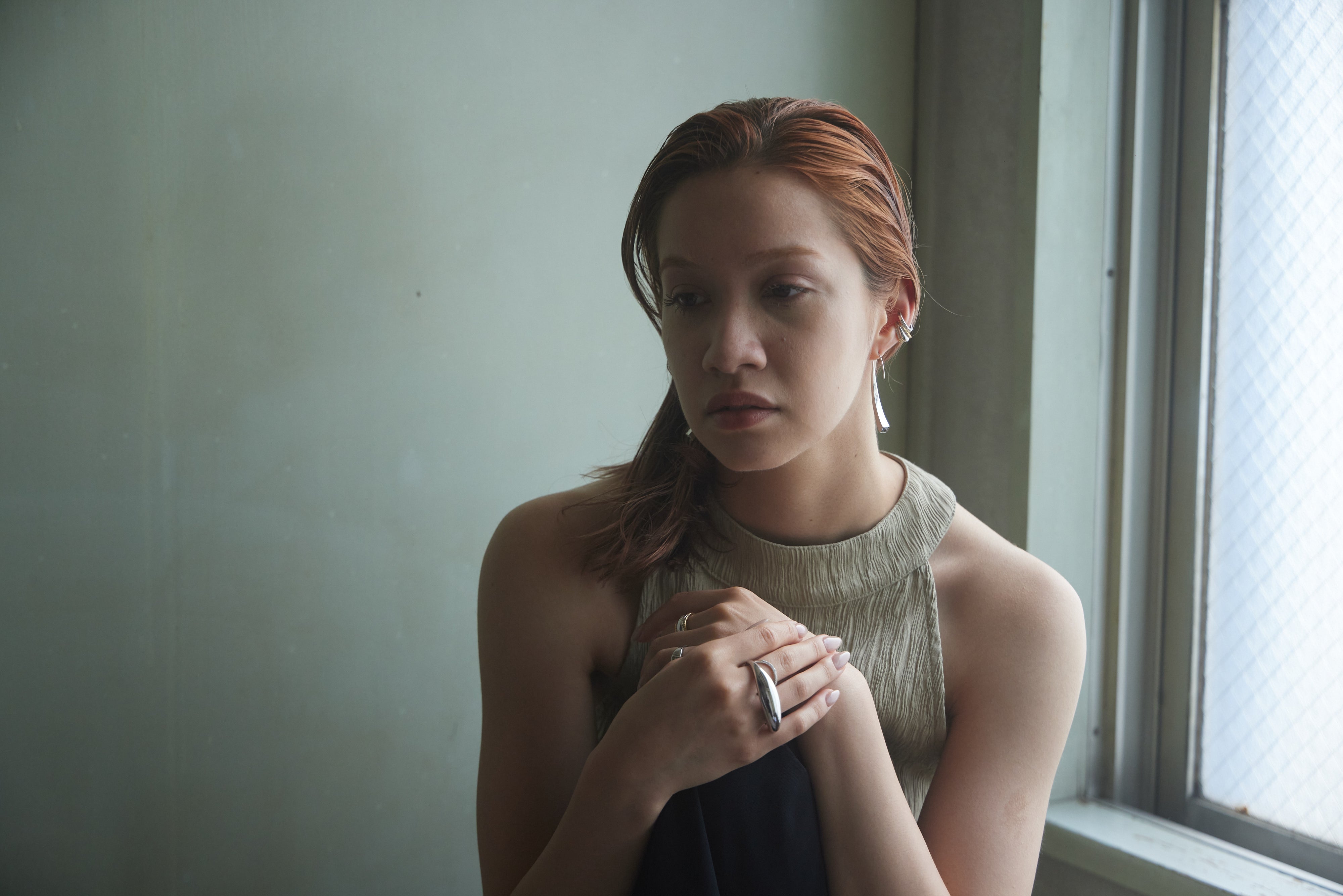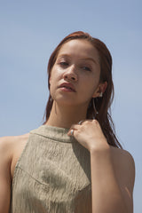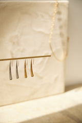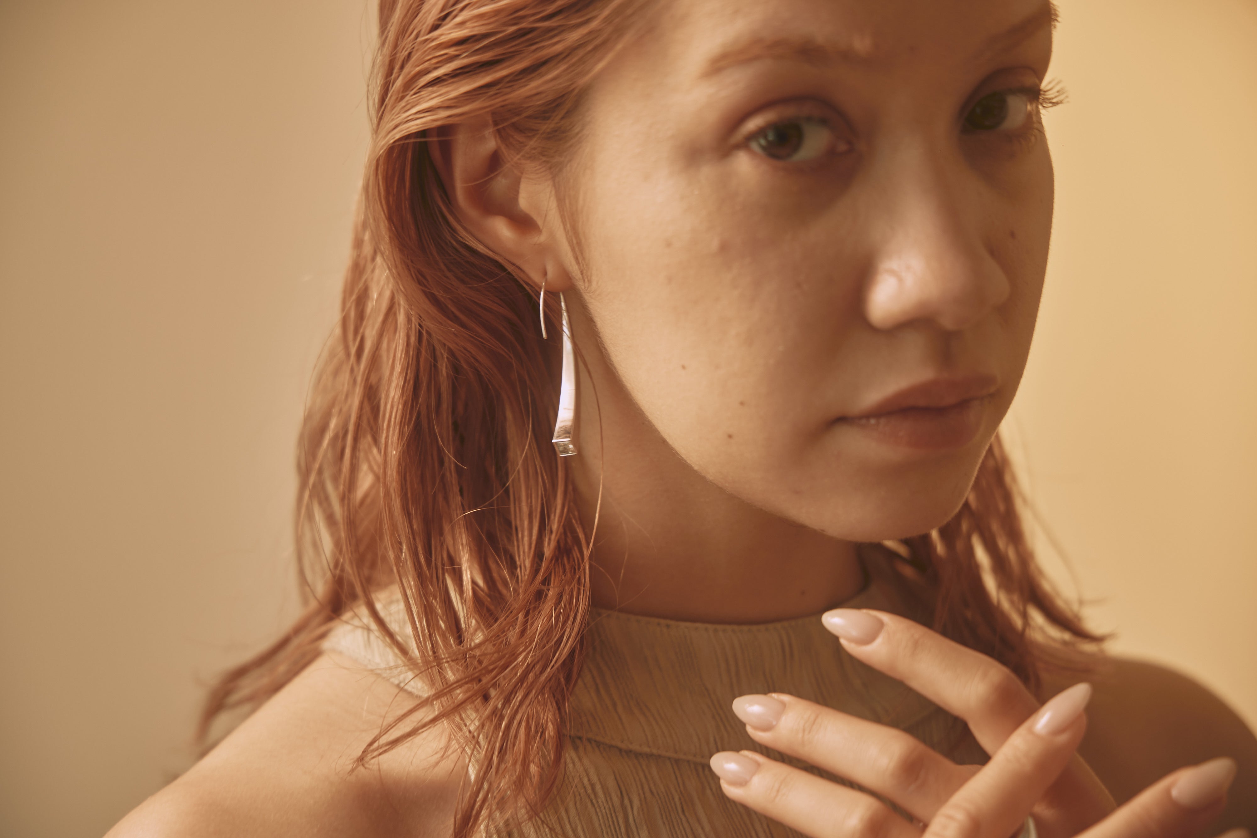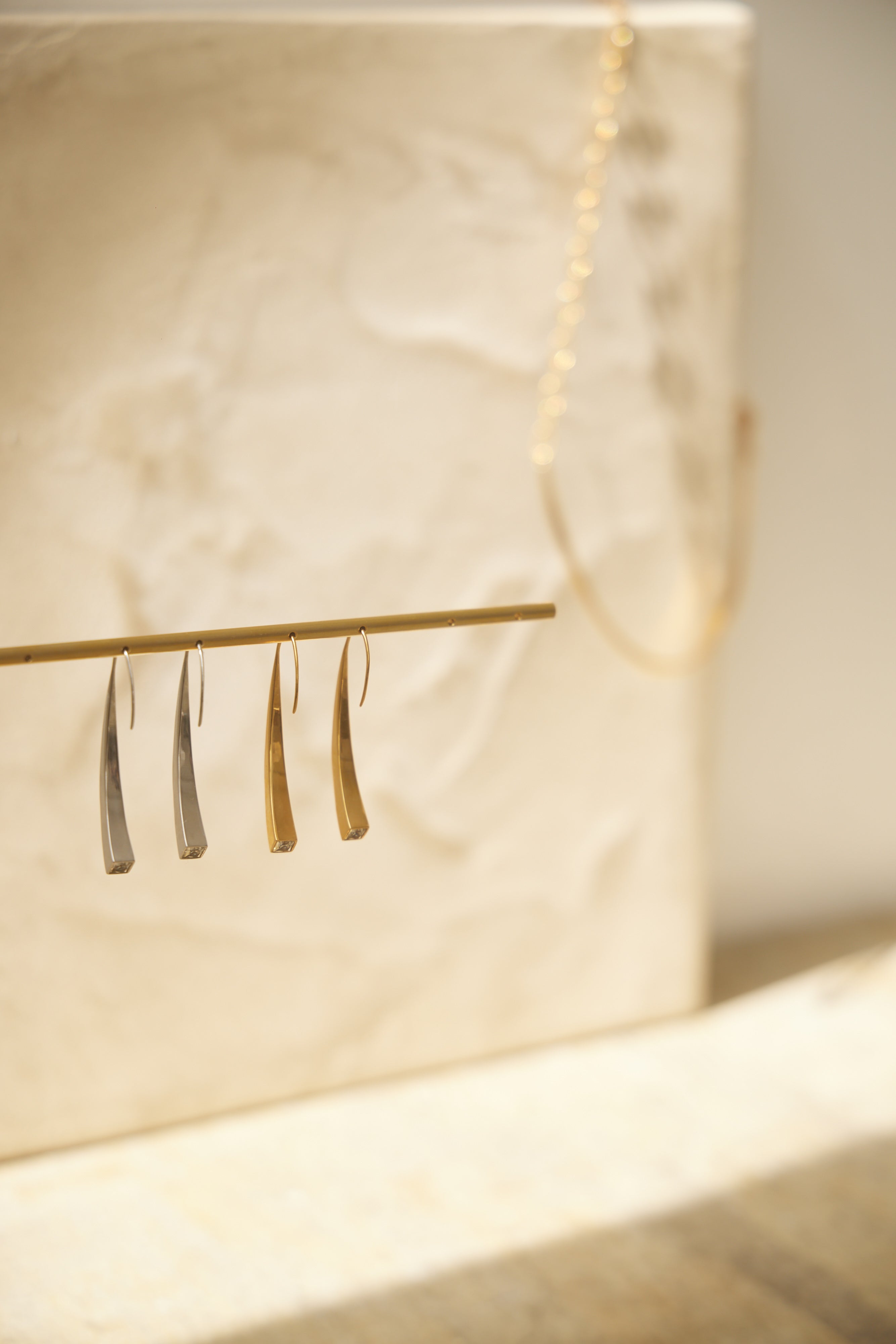 キャッチをなくし、耳たぶの後ろからフックを通すデザ インは無駄のないミニマムなデザインで、エッジの効いたピアス です。