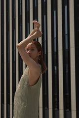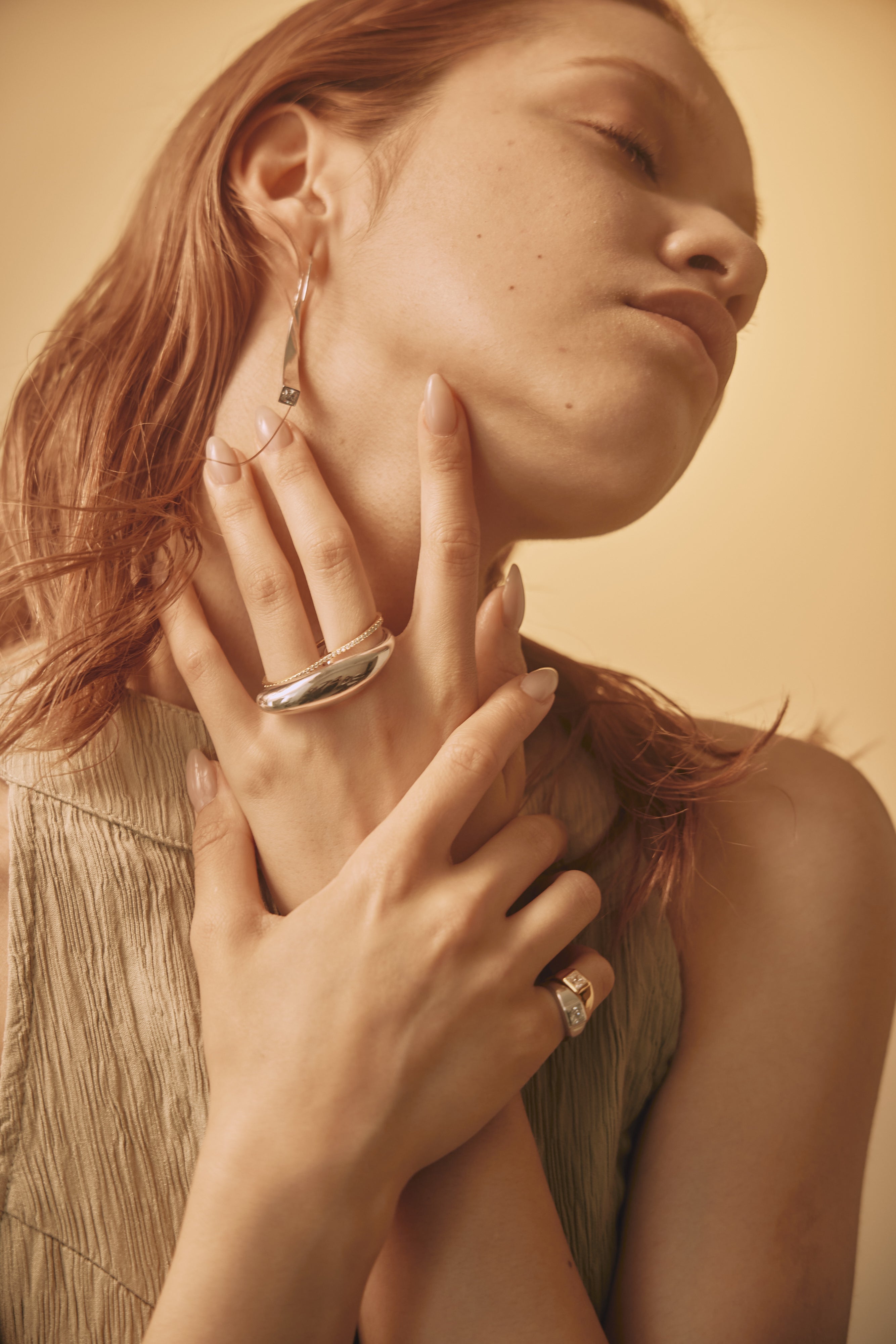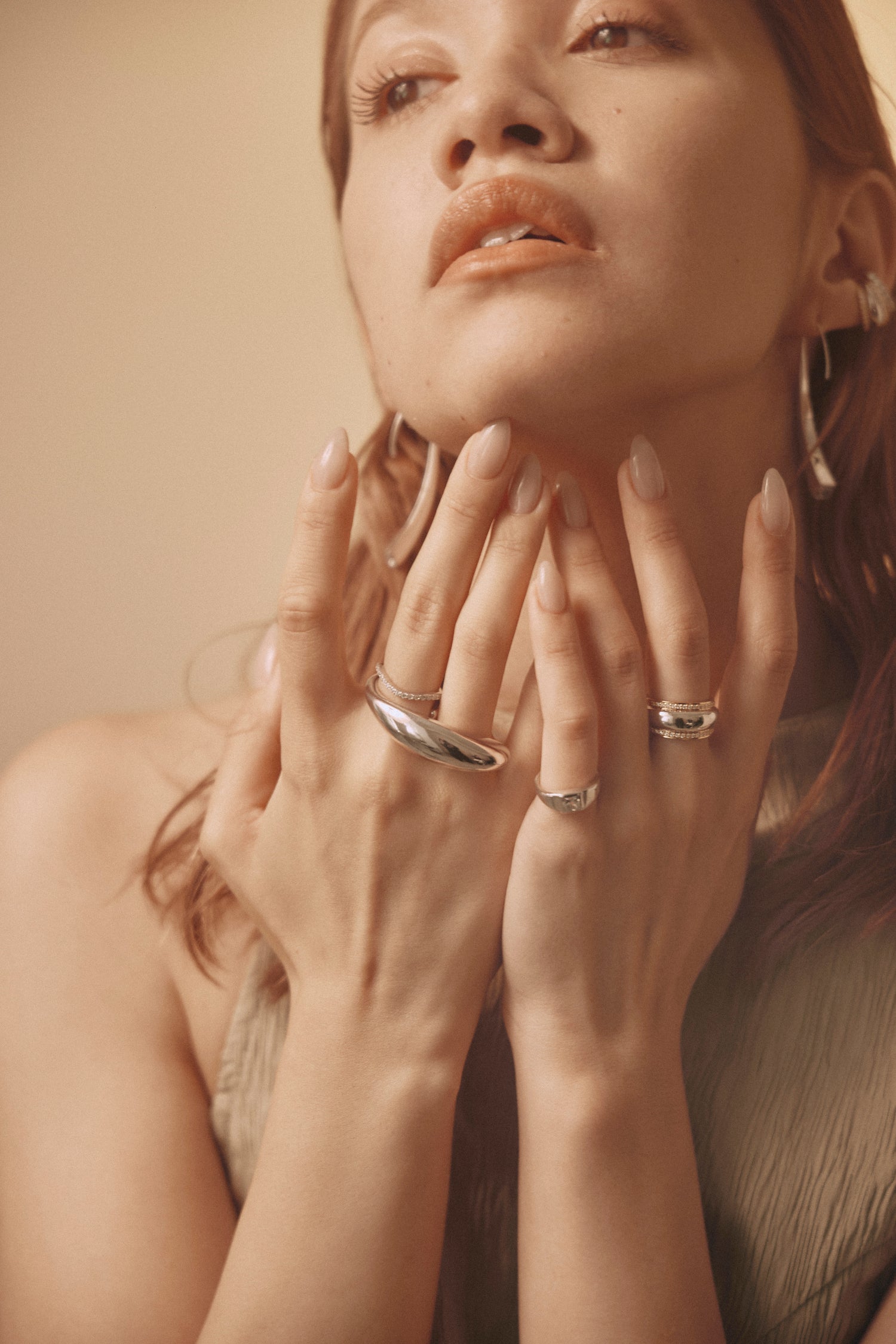 スクエアのクリスタルを先端にあしらい、カービング を効かせることで底面のクリスタルが揺れるたびに繊細な輝きを プラス。