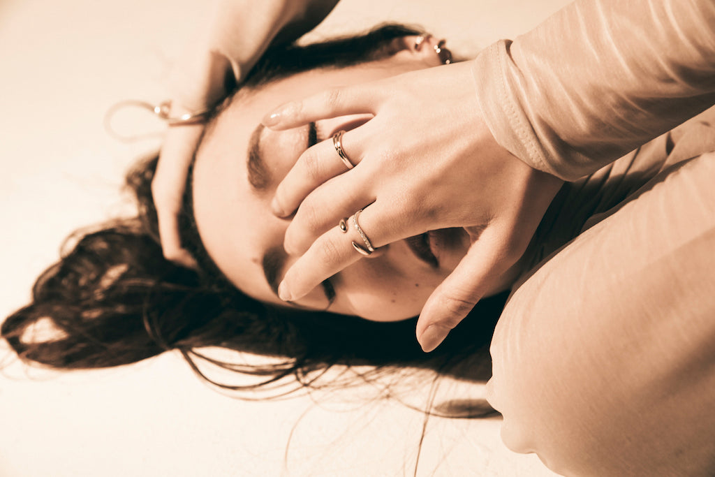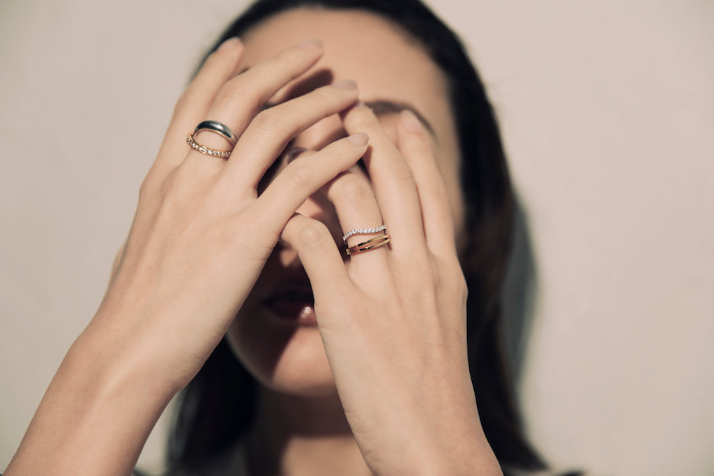 細い2本のゴールドラインのリング。華奢なラインながらもしっかり角を取ったデザインで手元をひきたてます。